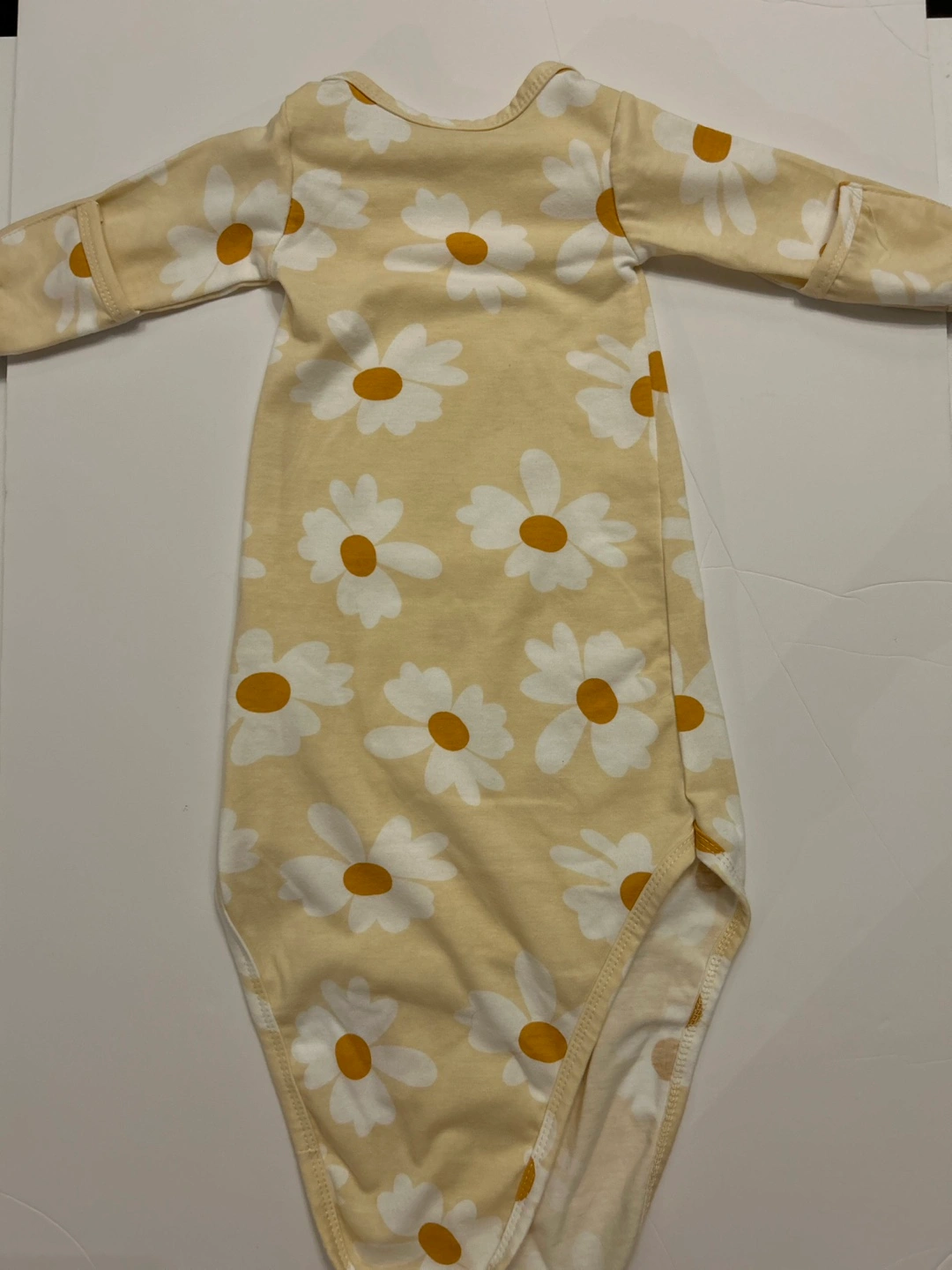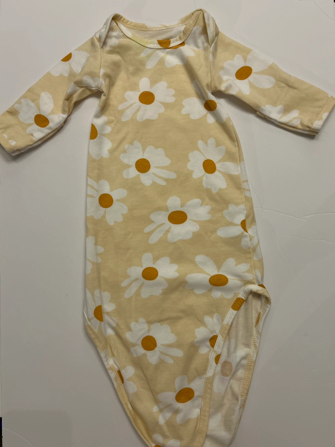 Adorable baby sleepsuit. Features a long-sleeved design and a charming daisy print. Soft and comfortable material. Perfect for bedtime with a knotted tie bottom for extra comfort.