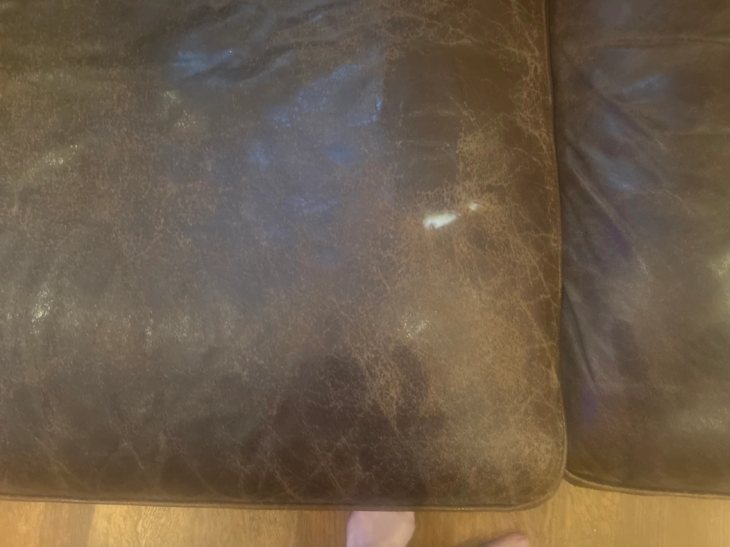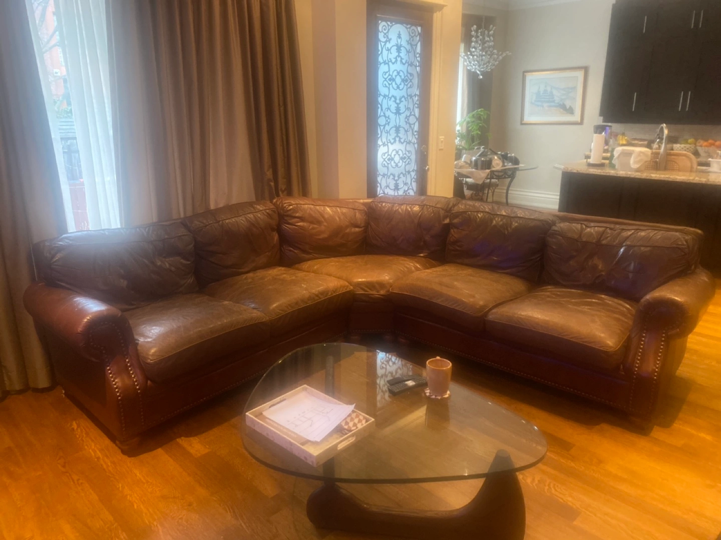 Brown leather sectional sofa. Has some wear and tear, but still comfortable and in fair condition. A few tears that can be mended with repair putty. Must pick up. Detaches into 2 sections for easier transport. Cash only. Sold as is.