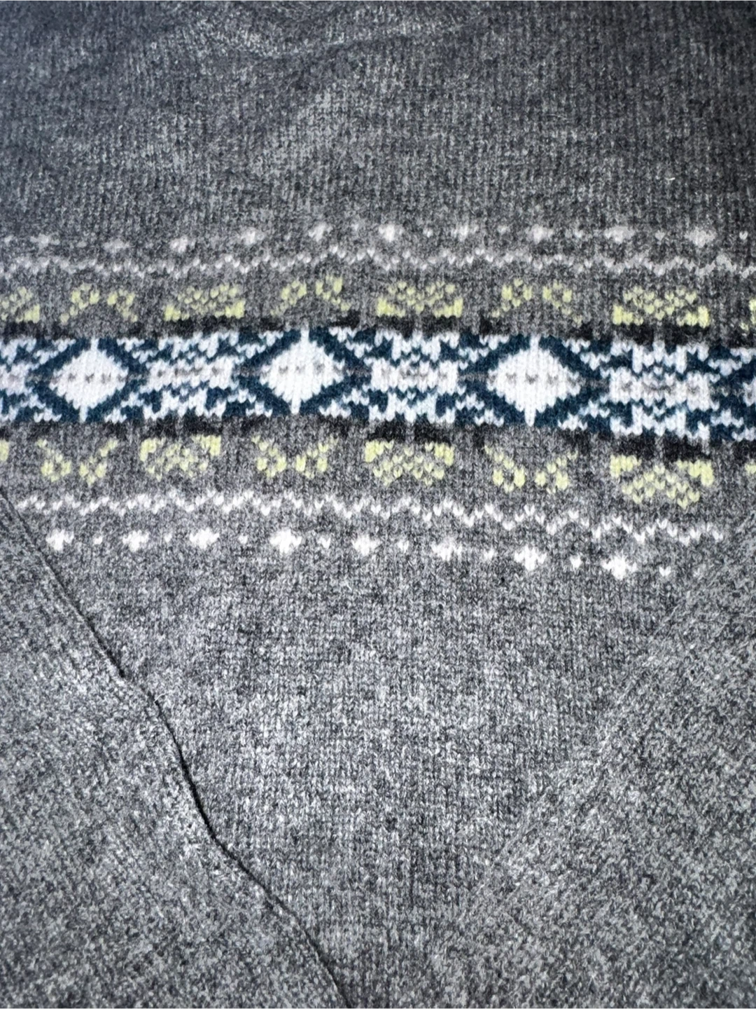 This is a GAP men's sweater with a classic Fair Isle pattern. It's made from 100% lambswool. The sweater is a size medium and features a grey base with a colorful geometric design across the chest and sleeves. Great for cooler weather!