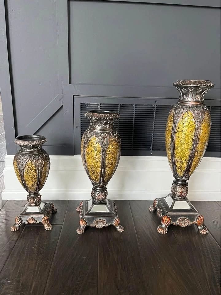 Selling these 3 candle holders. These are heavy and very good quality. See photos for all the measurements. Price is for all 3 candle holders. These fancy candle holders will add a touch to your dining tables, shelves, or even are perfect as centerpieces. In great condition. Pickup Hamilton Mountain, Rymal & Upper Gage. Let me know if you're interested!