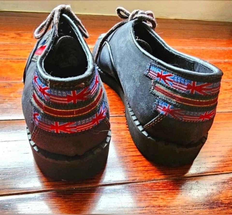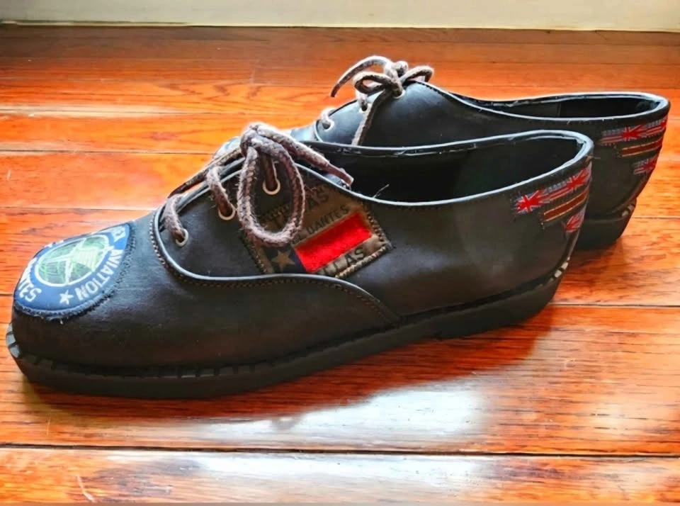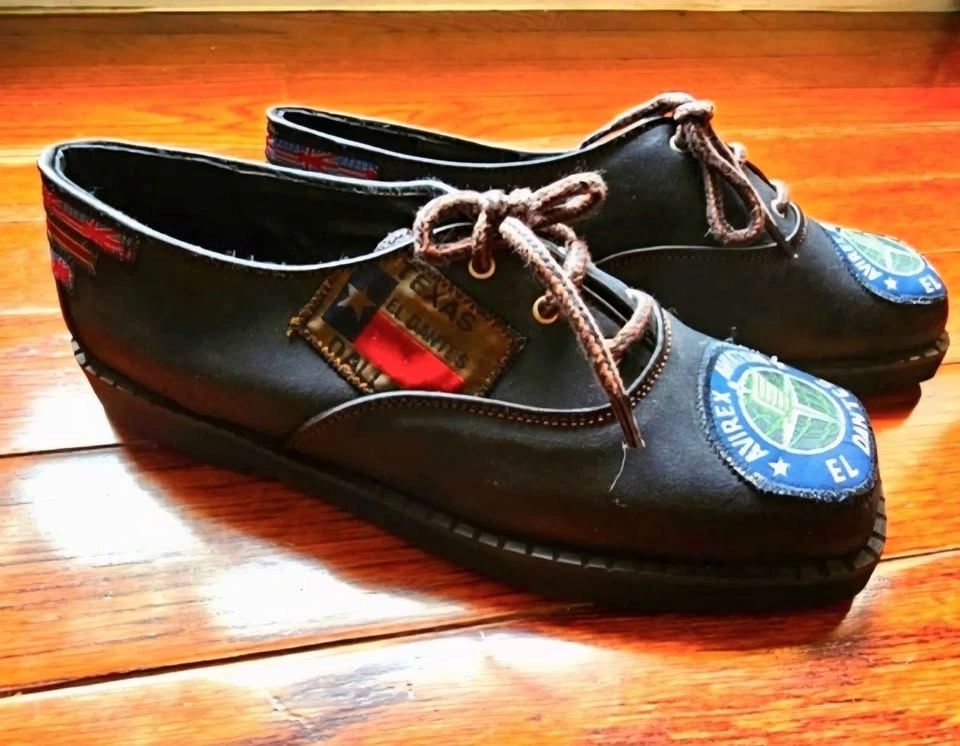 Unique and eye-catching vintage black suede leather shoes from El Dantes, made in Spain. These are deadstock and in like new condition. There is a bit of scuffing to the uppers from bumping around in storage but the soles show no wear. These shoes feature patches all over that have UK and US national flags, a Dallas Texas logo, and an Avirex Aviation logo for a retro flair.