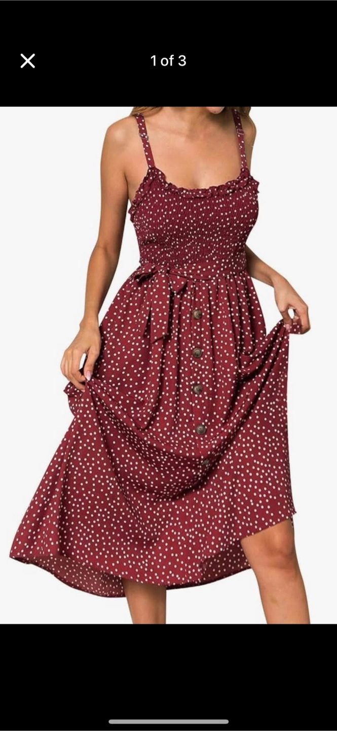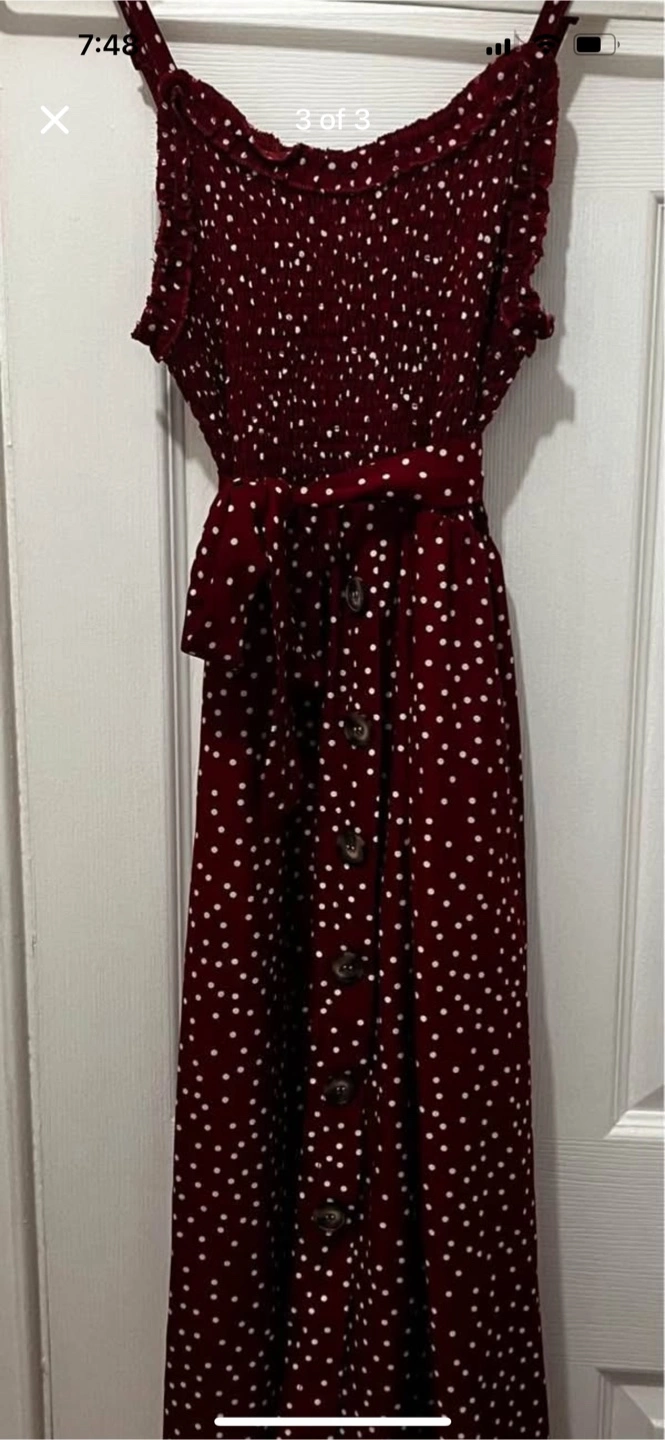 Red dress with white polka dots! It has a smocked bodice and button-down front with a tie at the waist. The material is lightweight and perfect for summer days! ***Pick up at