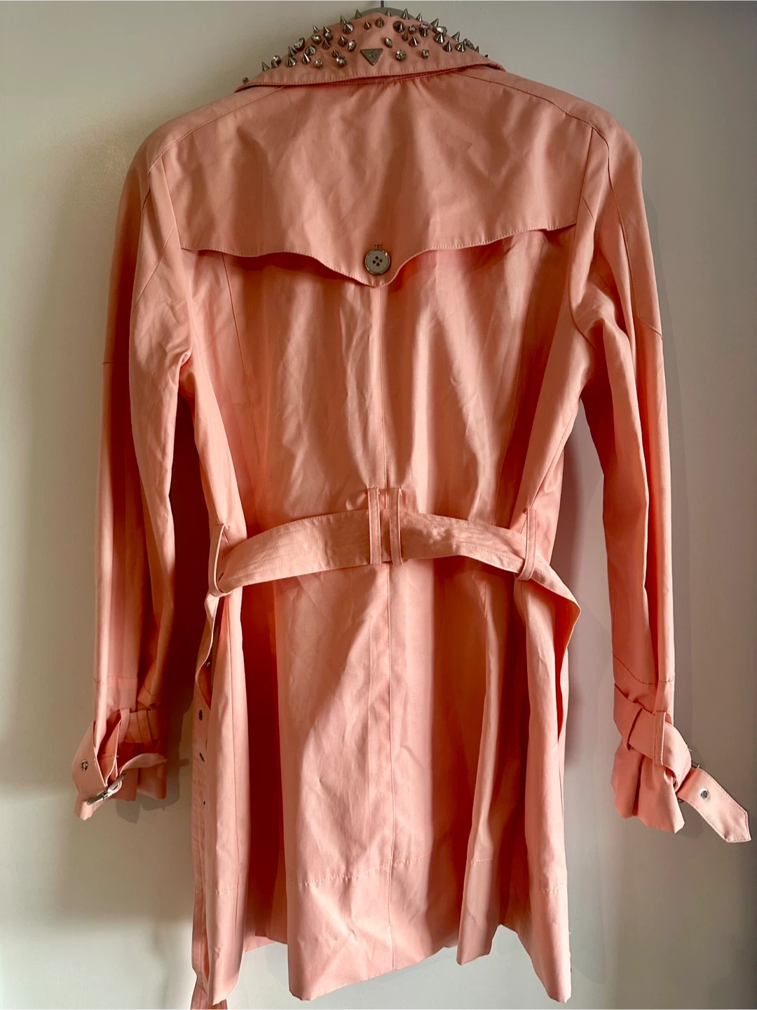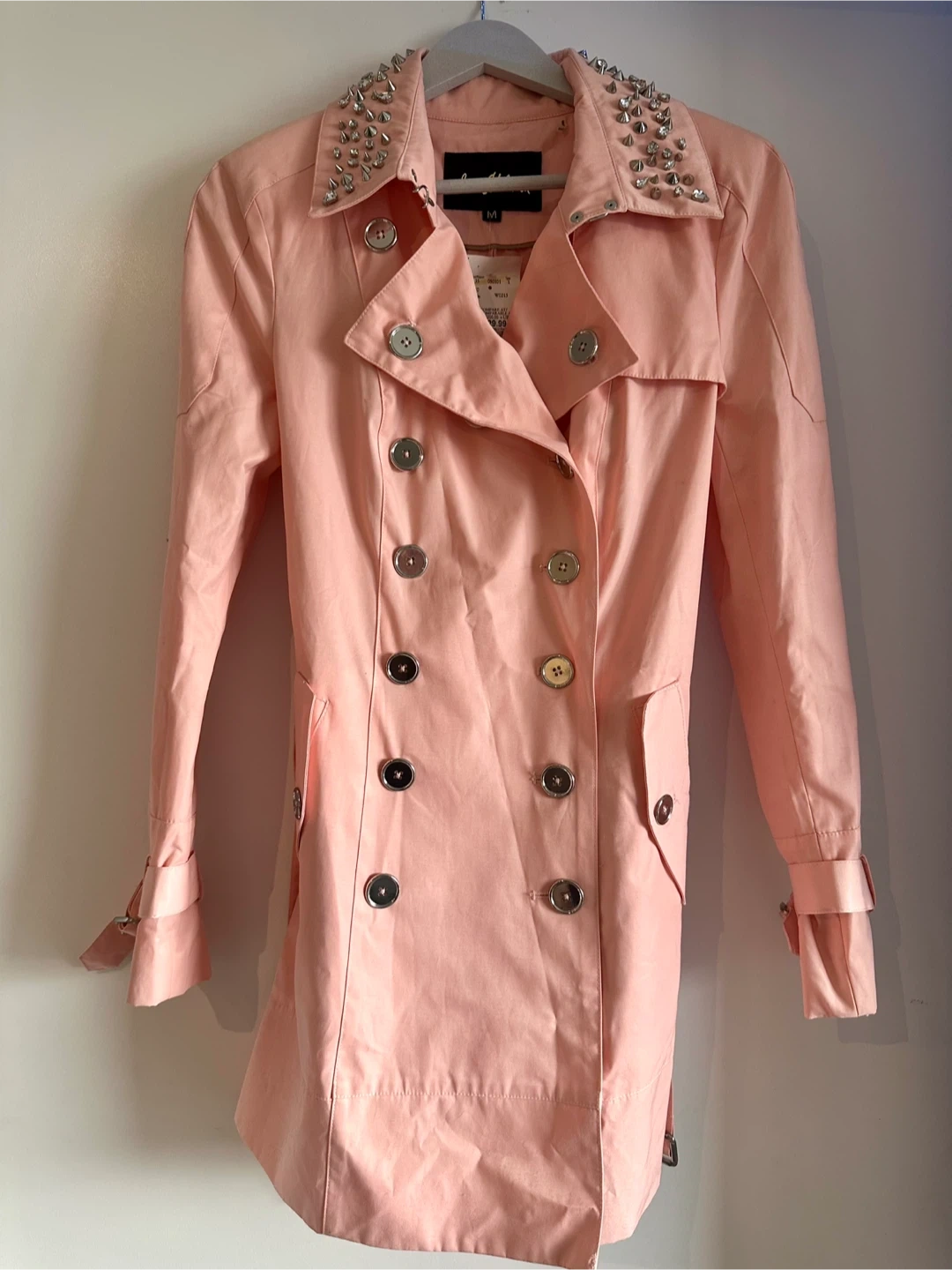 NNW Selling a Sam Edelman trench coat in a lovely pink colour! It's a size medium and features unique stud detailing on the collar. The coat also has a belt to cinch the waist. Originally bought for $129.99!