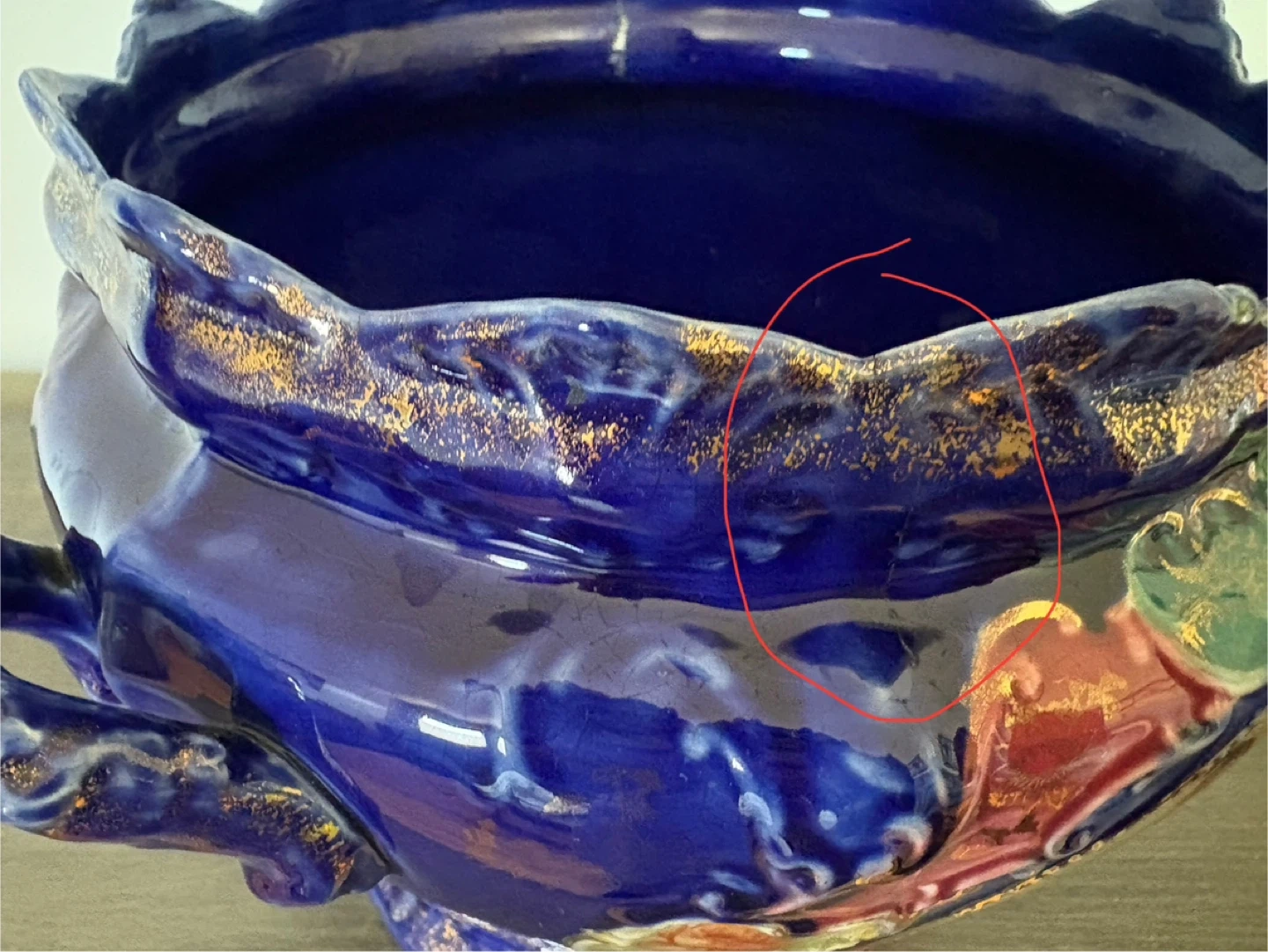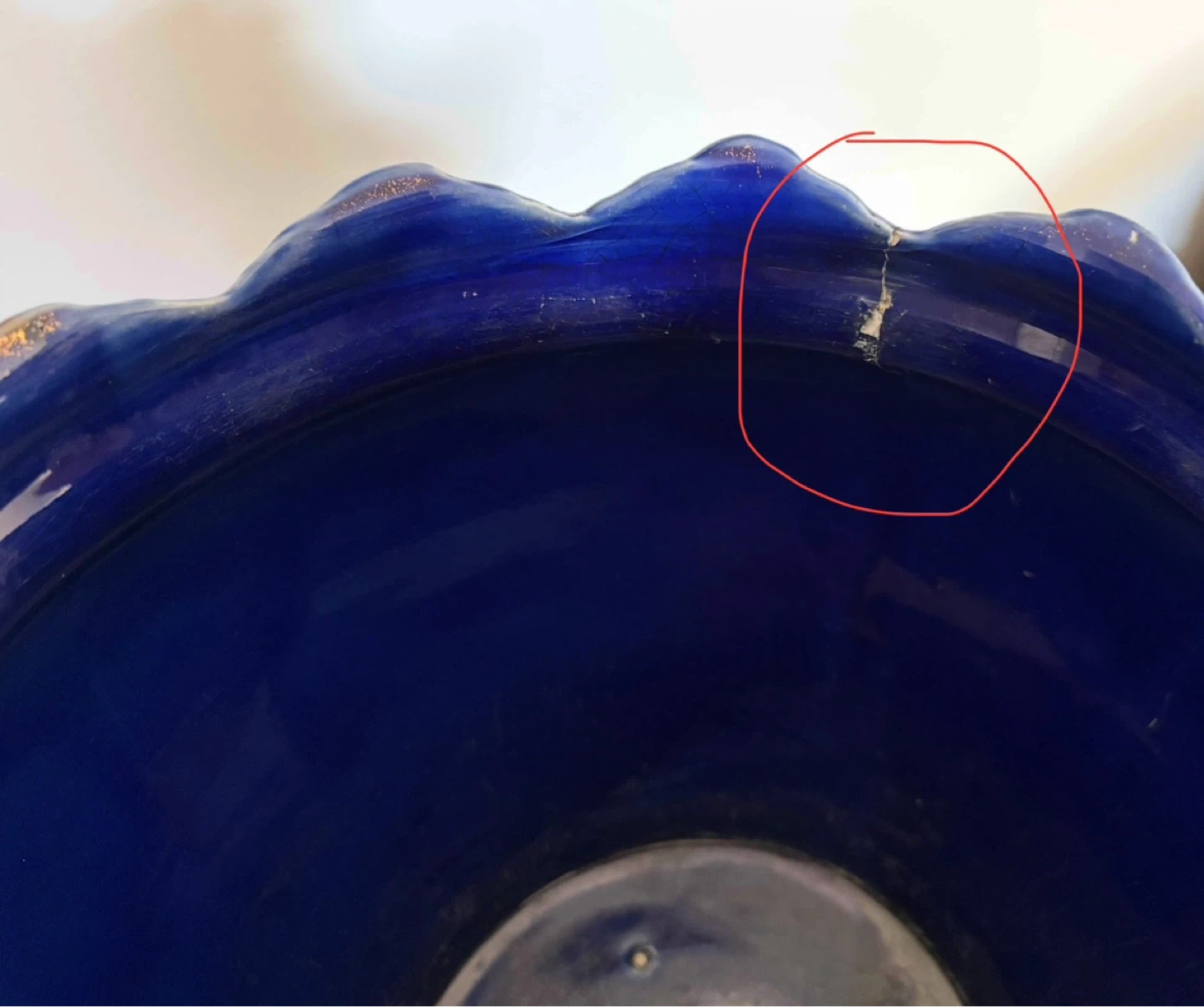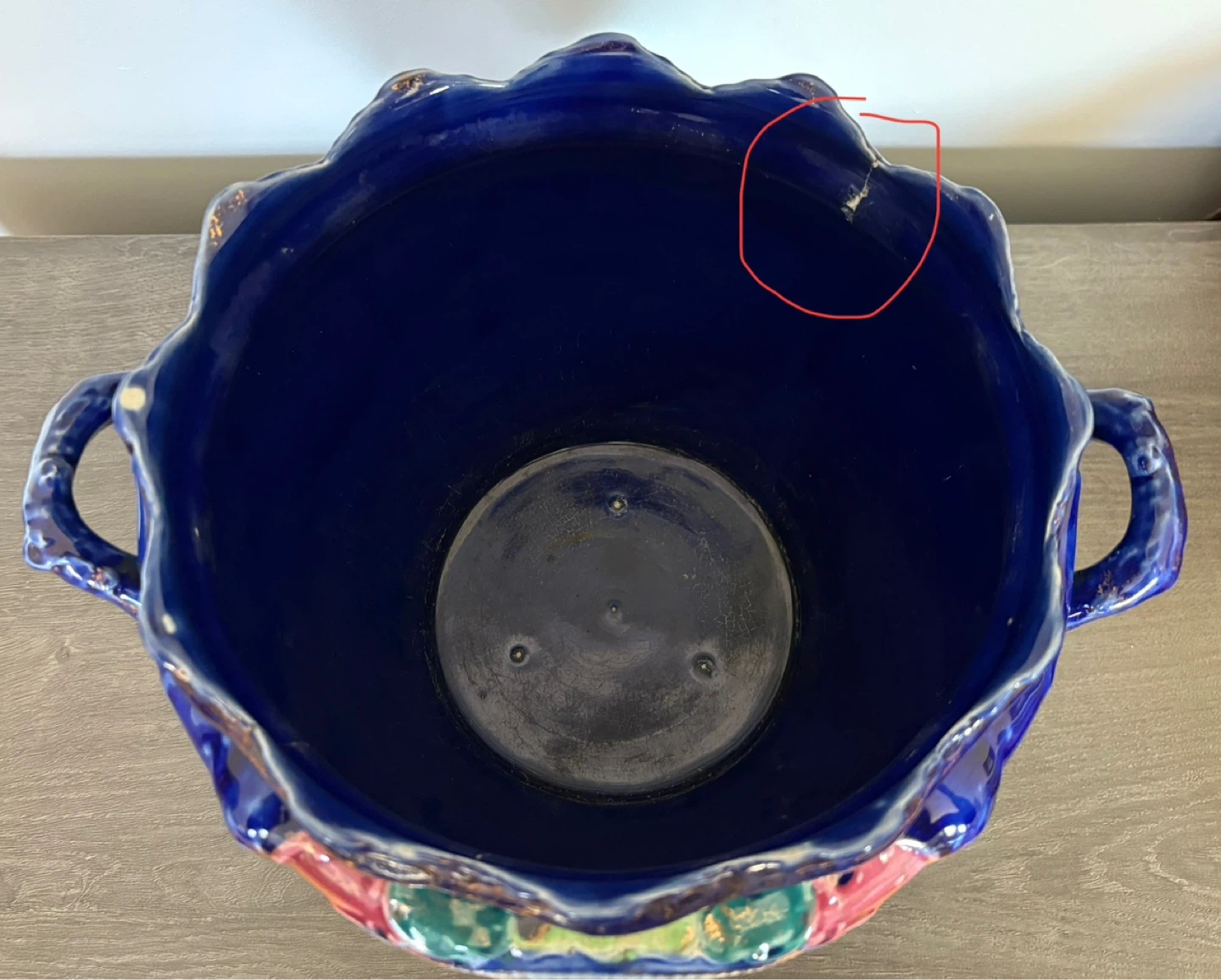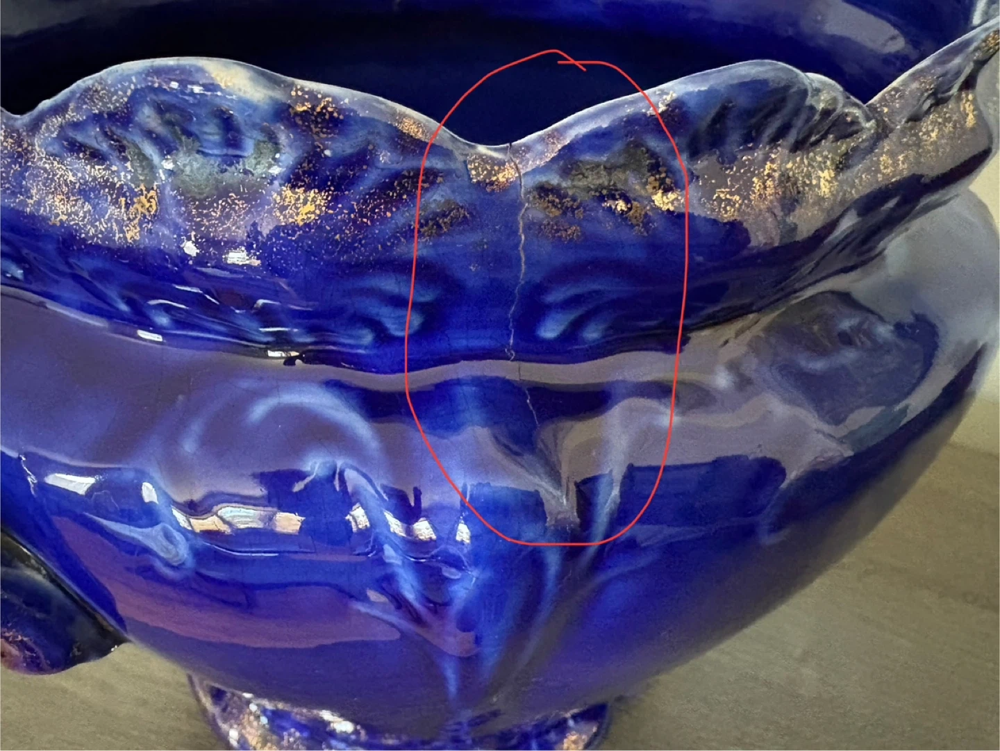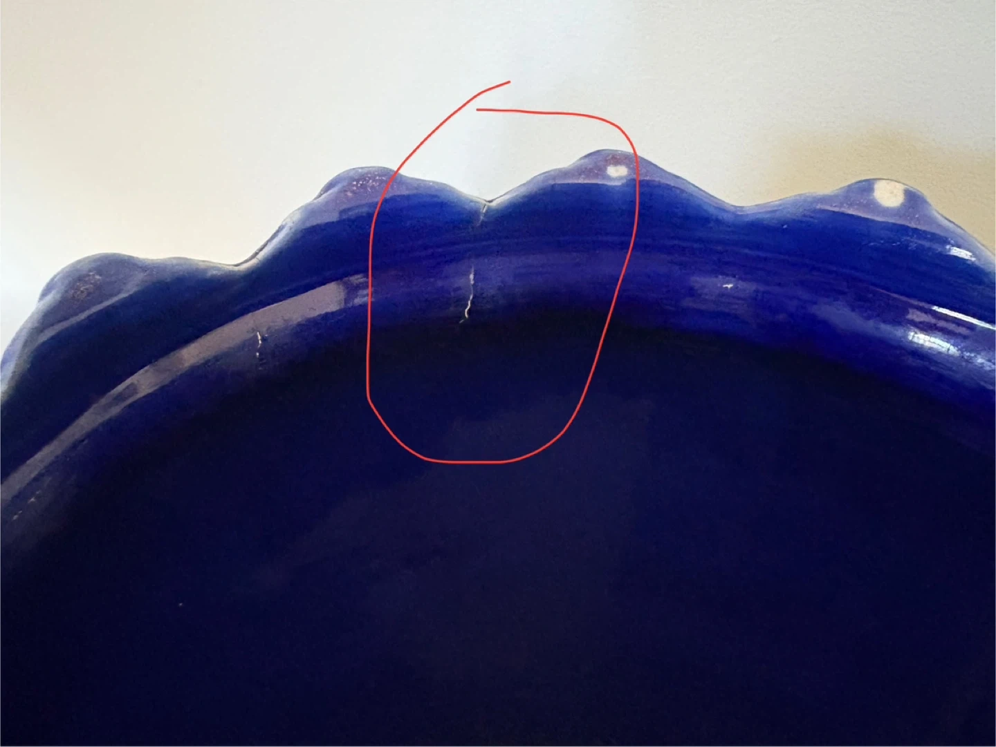 There are two tiny small cracks along the rim, but they don’t affect the integrity or appearance of the pot (not visible from the outside). It remains solid, sturdy, and absolutely stunning.