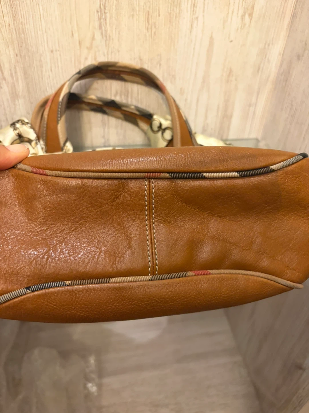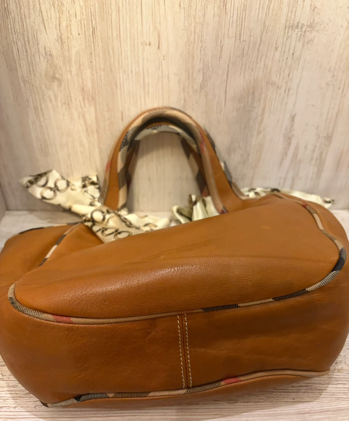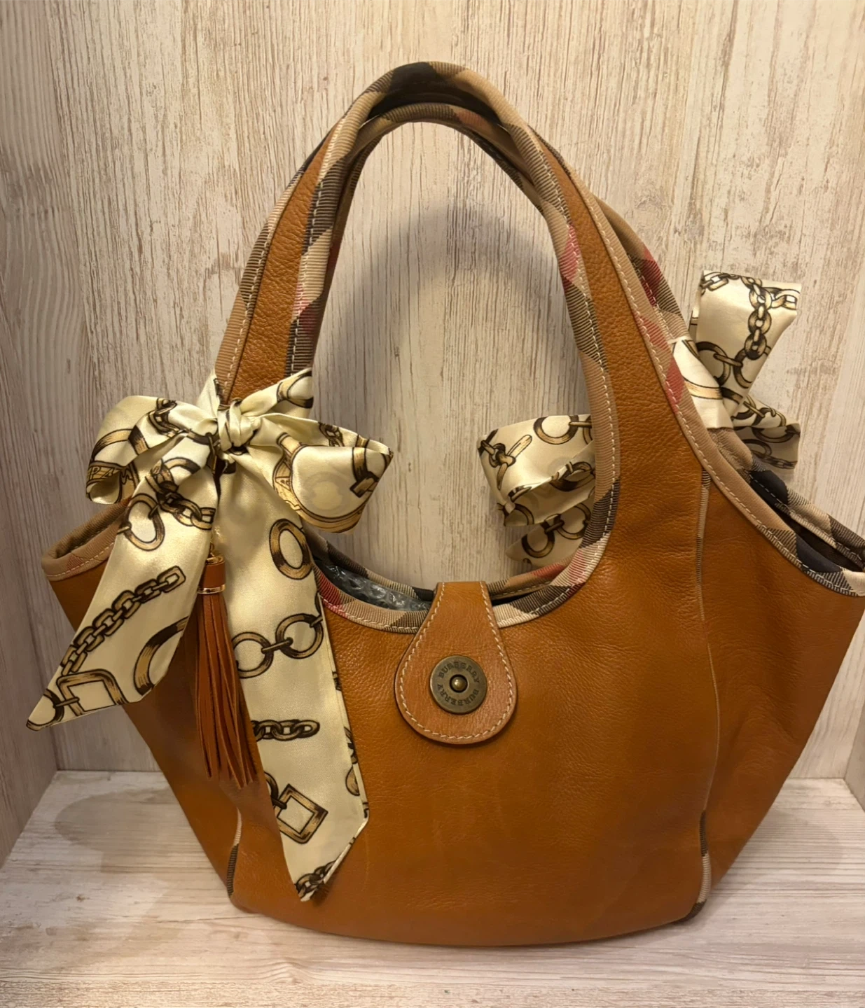 This is a Burberry tote bag made from tan leather. It features the iconic Burberry dark brown lining and comes with a decorative scarf tie. Snap closure. Very clean and EUC . Complimentary tiwllies and tazzle . Water mark on bottom of the purse around not noticeable because of the leather color . I can send video