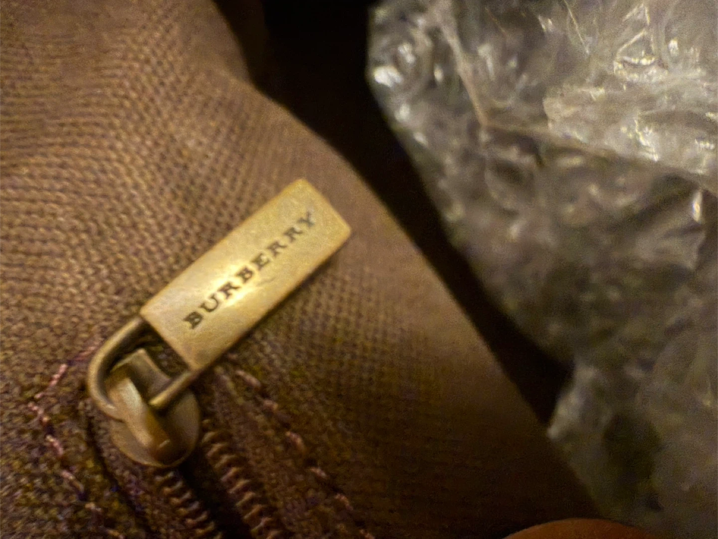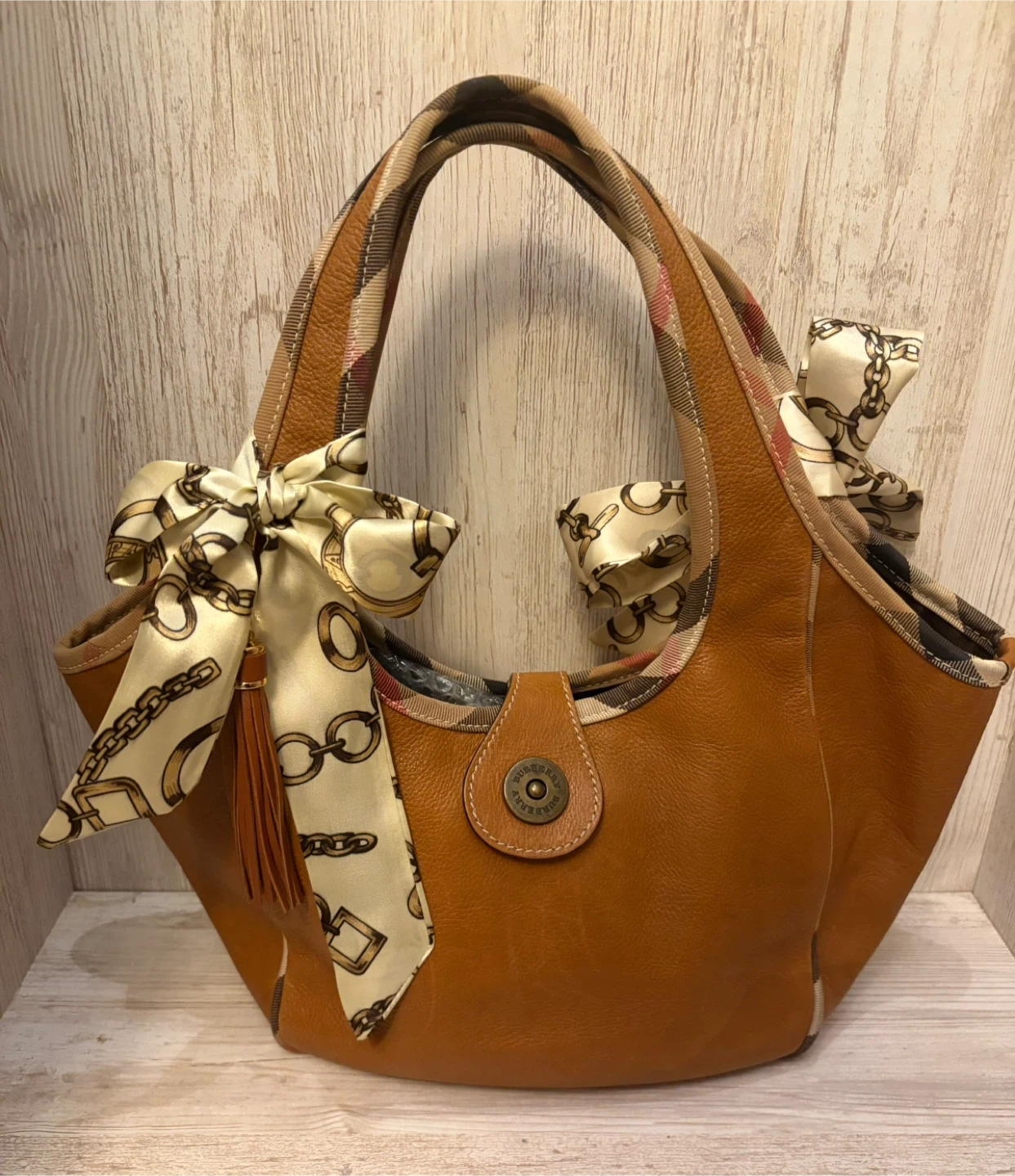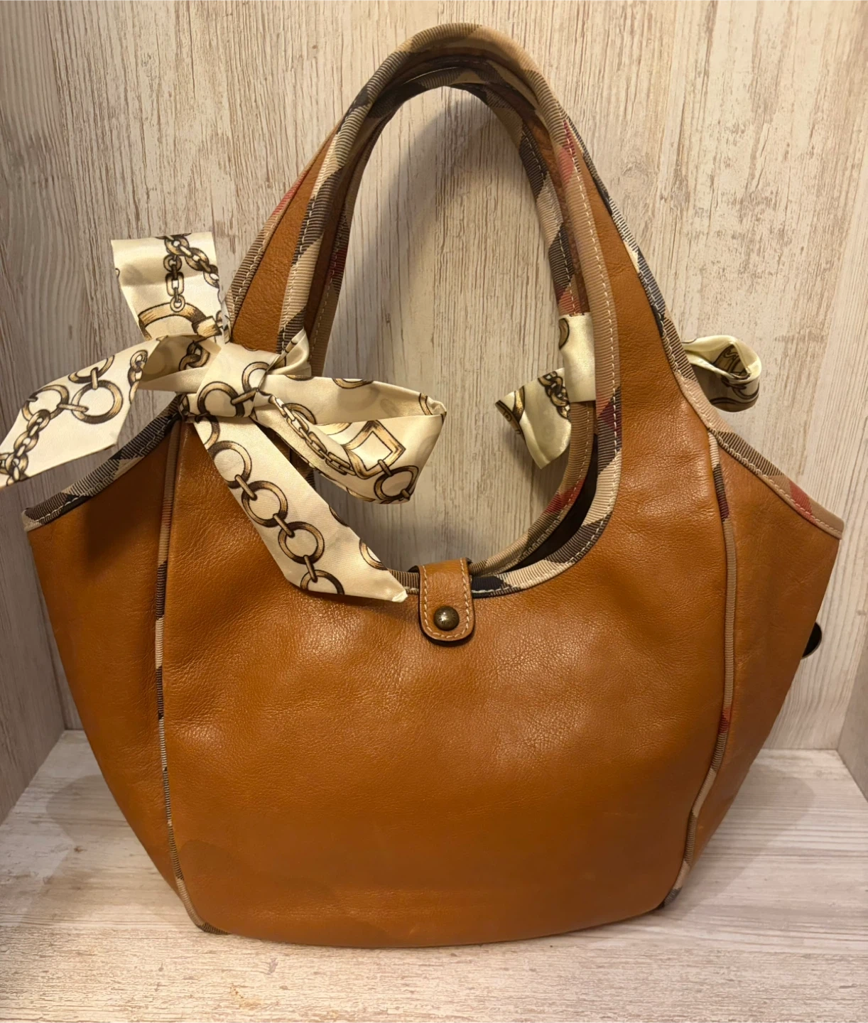 This is a Burberry tote bag made from tan leather. It features the iconic Burberry dark brown lining and comes with a decorative scarf tie. Snap closure. Very clean and EUC . Complimentary tiwllies and tazzle . Water mark on bottom of the purse around not noticeable because of the leather color . I can send video