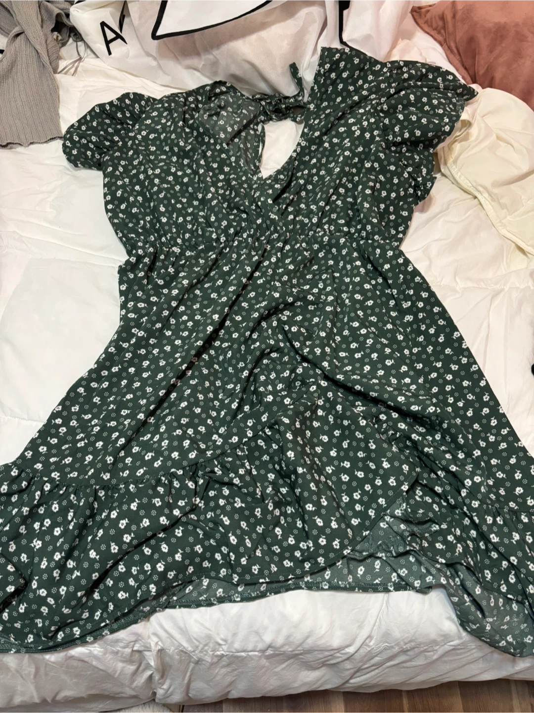 This SHEIN Curve dress has a dark green base with a white floral print. It features a V-neck and short, ruffled sleeves. Made in China. Size 1XL.