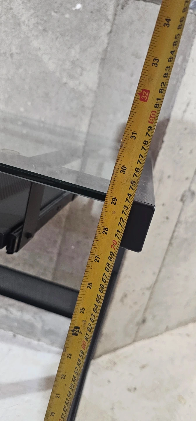 This desk features a clear glass top and a black metal frame. It includes a pull-out keyboard tray for added convenience. The desk is 29 inches high.