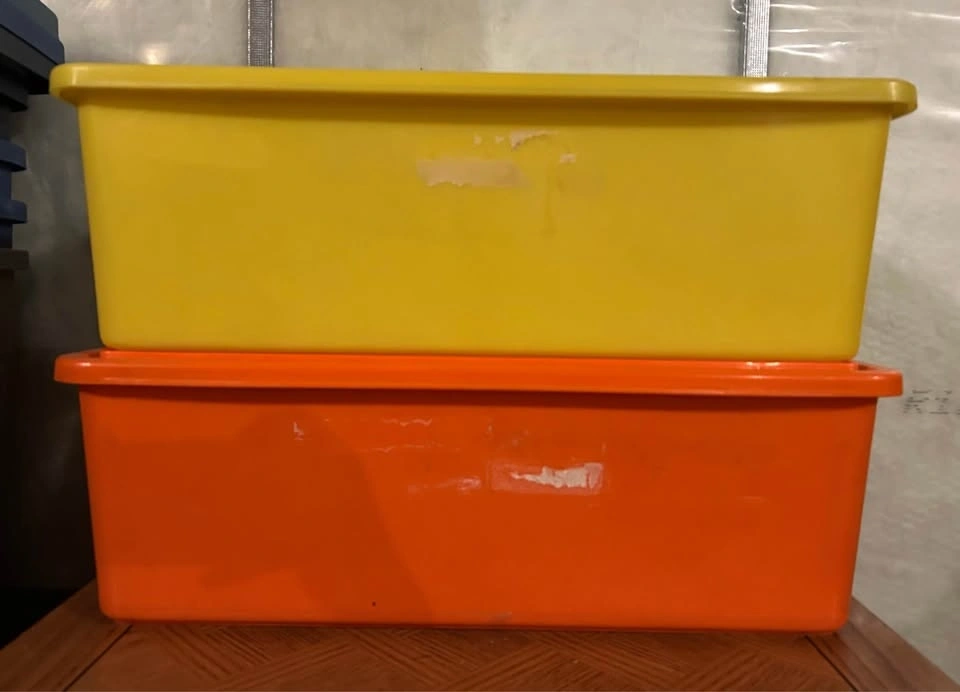 Containers has some minor marks and scuffs and some tape residue on the outside.