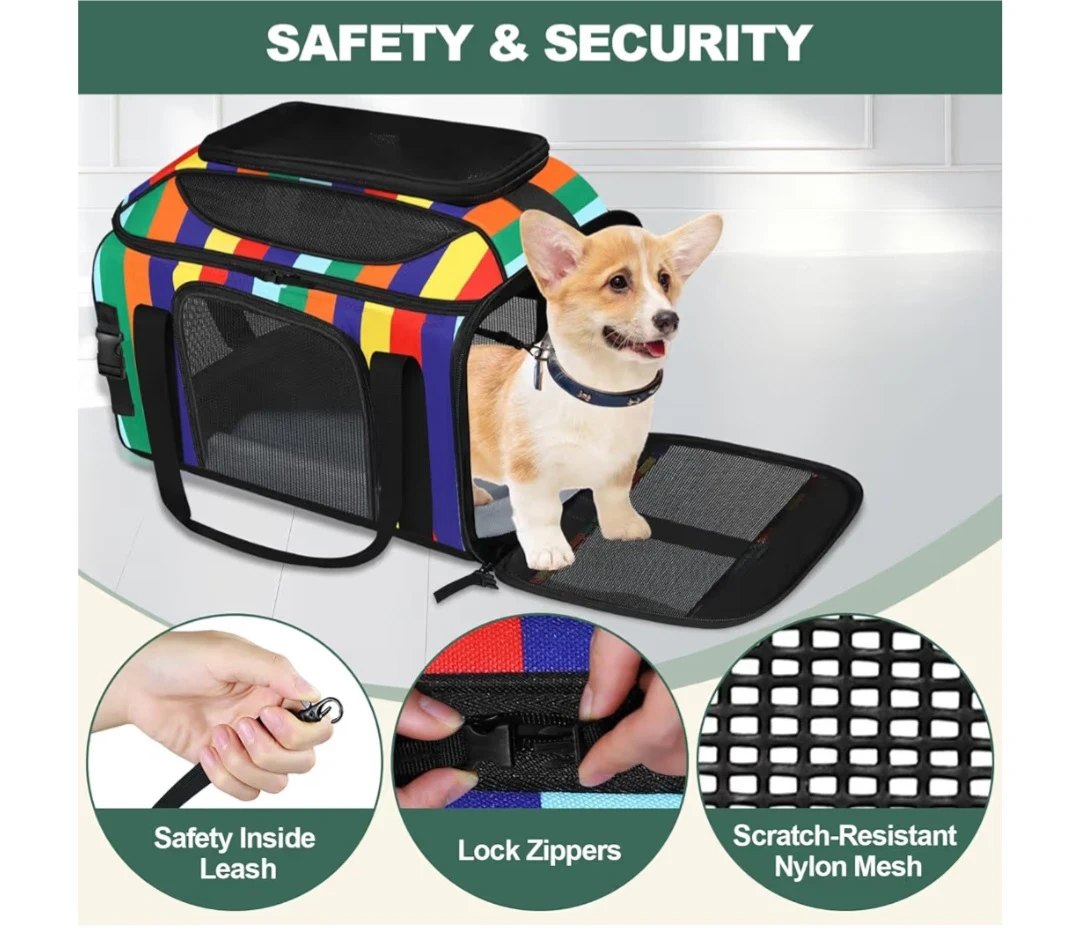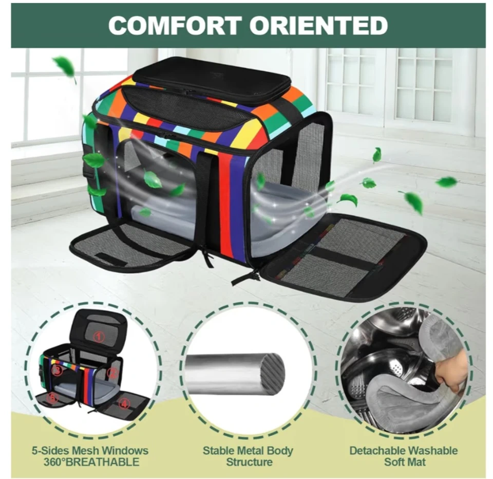 Comfortable and secure pet carrier with breathable mesh windows. Soft carrier for small dog, cat with 5-sides mesh windows. It's made with a stable metal body structure and comes with a detachable, washable soft mat. Lock zippers ensure safety during travel. This carrier is great for taking pets to the vet or on trips!
