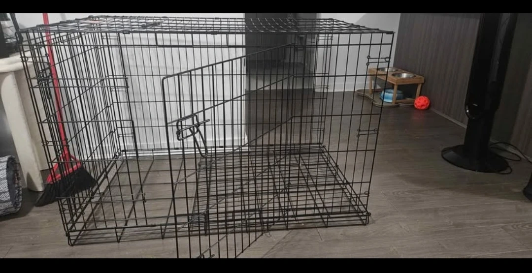This is a sturdy black metal dog crate with a single door. It's suitable for medium to large dogs. The crate is easy to assemble and has a convenient carrying handle on top. It folds flat for storage.