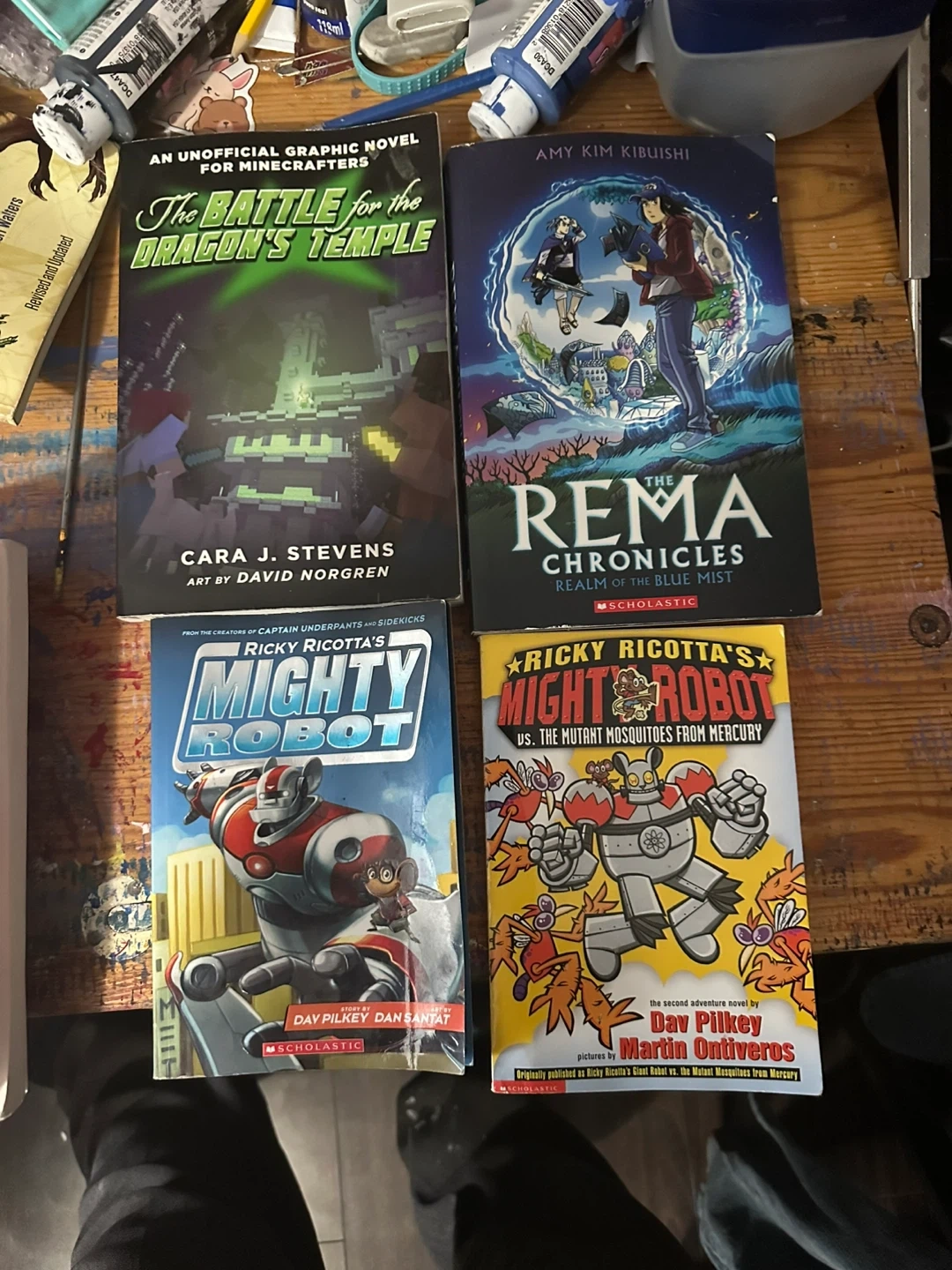This bundle includes four children's books: 'The Battle for the Dragon Temple' and 'The Rema Chronicles: Realm of the Blue Mist'. It also features two books from the Ricky Ricotta series: 'Ricky Ricotta's Mighty Robot' and 'Ricky Ricotta vs. the Mutant Mosquitoes from Mercury'. Great for young readers interested in adventure and science fiction!