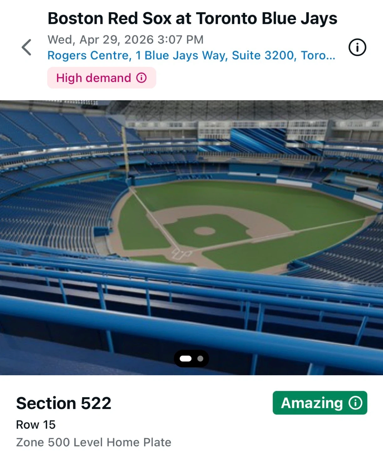 Boston Red Sox play the Toronto Blue Jays at Rogers Centre. Game date is Wednesday, April 29, 2026, with a 3:07 PM start time. Seats are in Section 522, Row 15. Please see pictures of the seats it gives a great view.