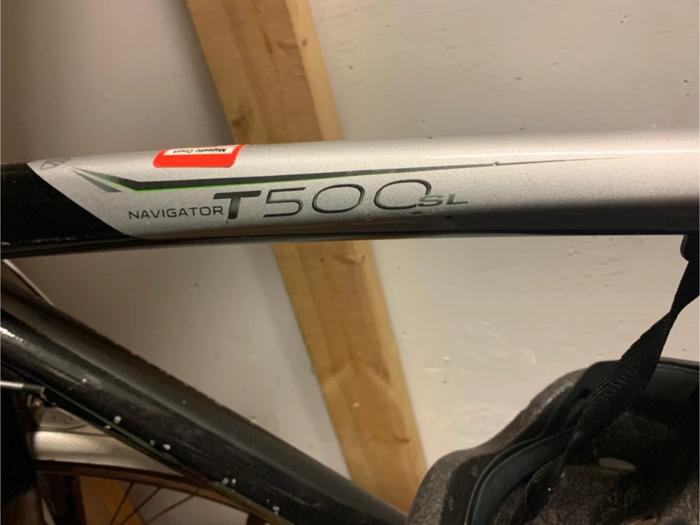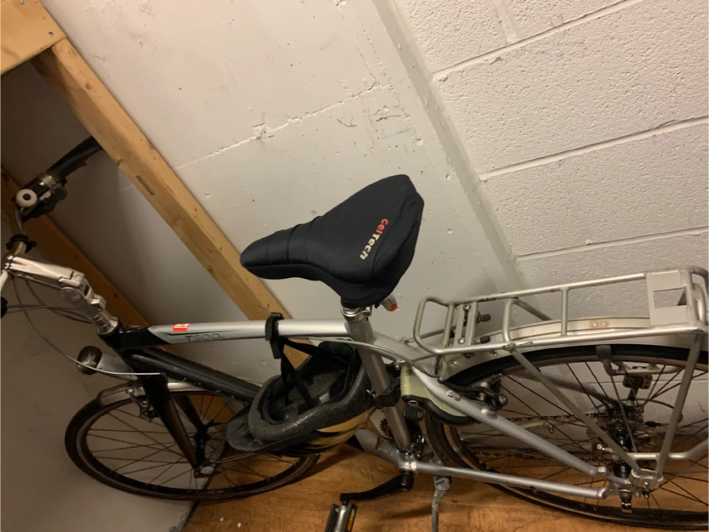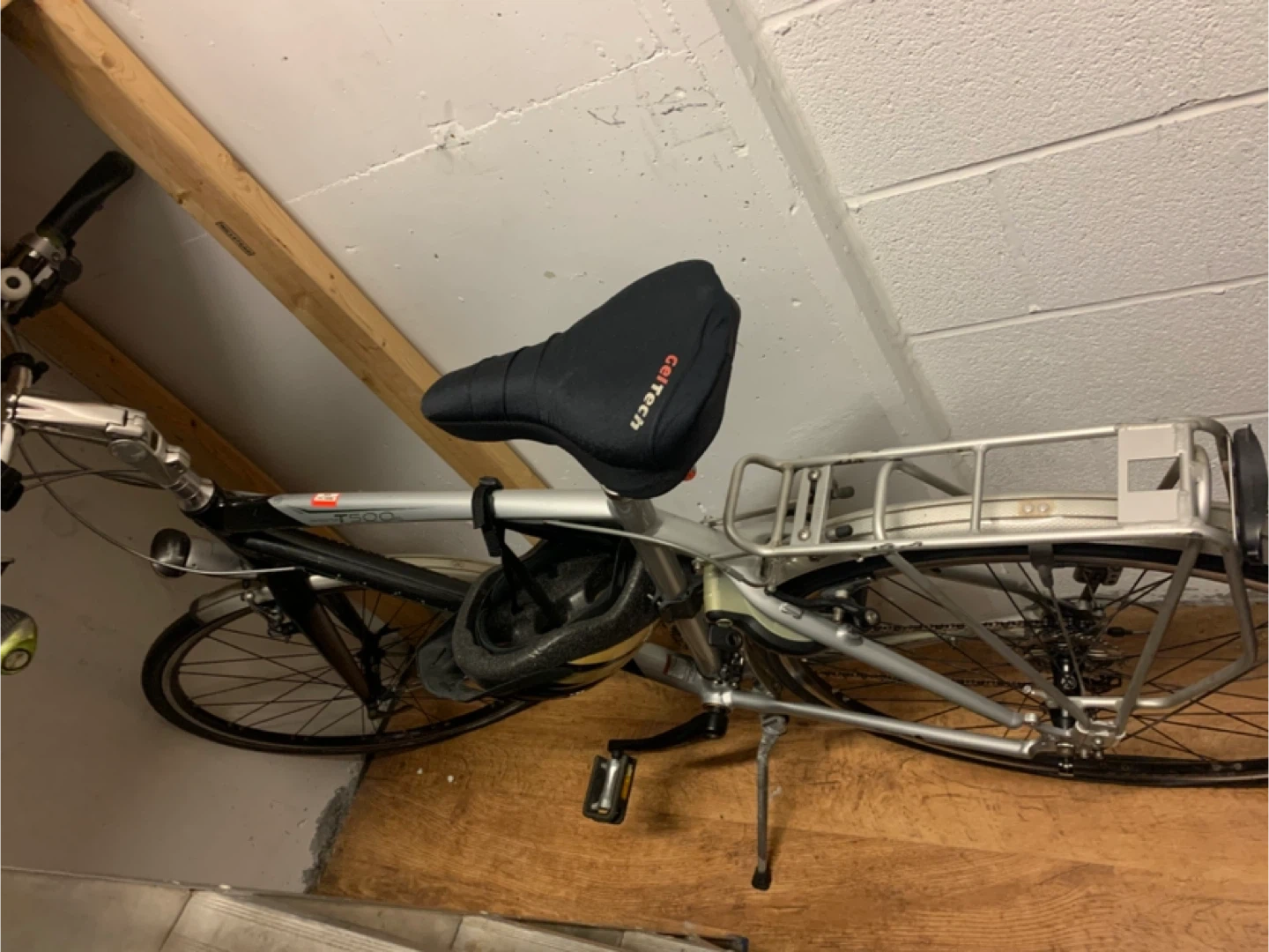 This is a DUTCH bicycle Trek Navigator T500SL hybrid bicycle with a comfortable GelTech seat cover. It features a rear rack for carrying items. The frame is silver and black. This bike is great for commuting or recreational rides!