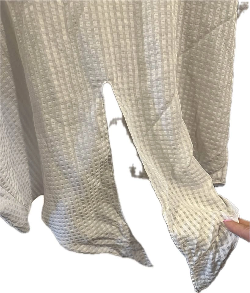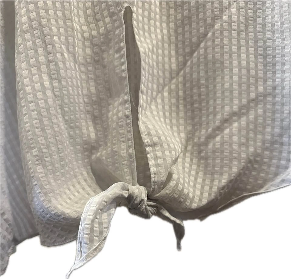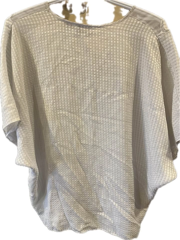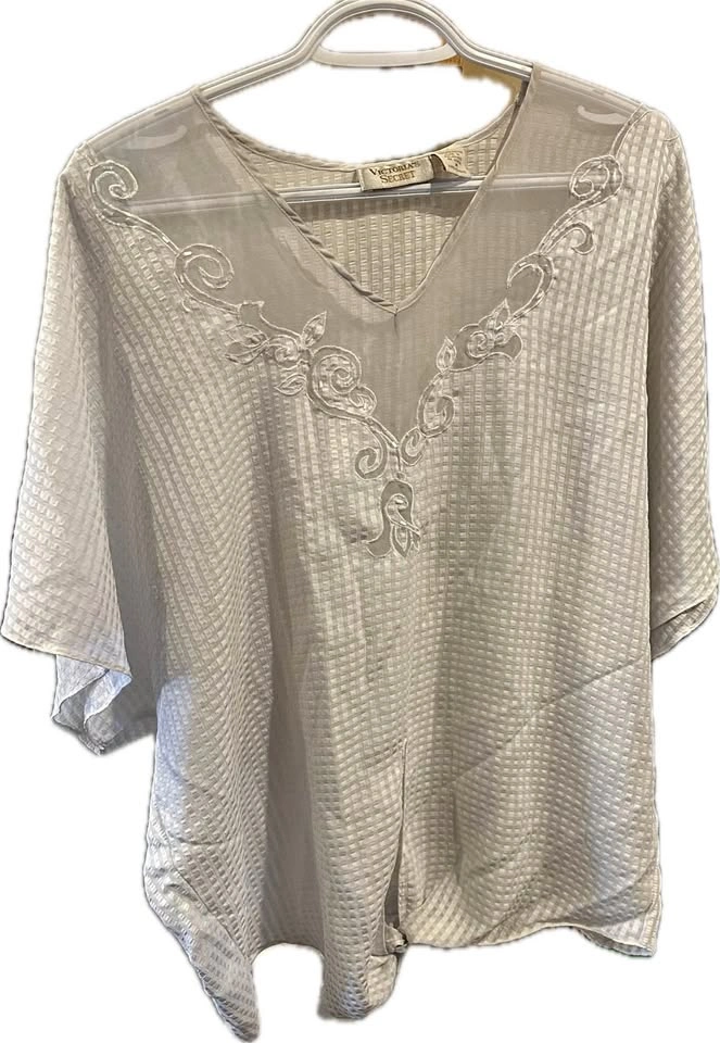 White, sheer fabric with a subtle embroidered floral pattern. Features dolman-style short sleeves and front ties that can be knotted at the waist. Could be worn as a beach cover-up or for any occasion. In fantastic condition!