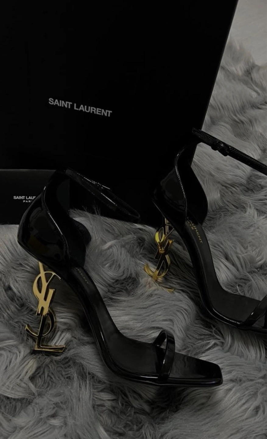 83Elegant black patent leather heels. Gold YSL logo heel detail. Ankle strap closure. used once, comes with box and bag
