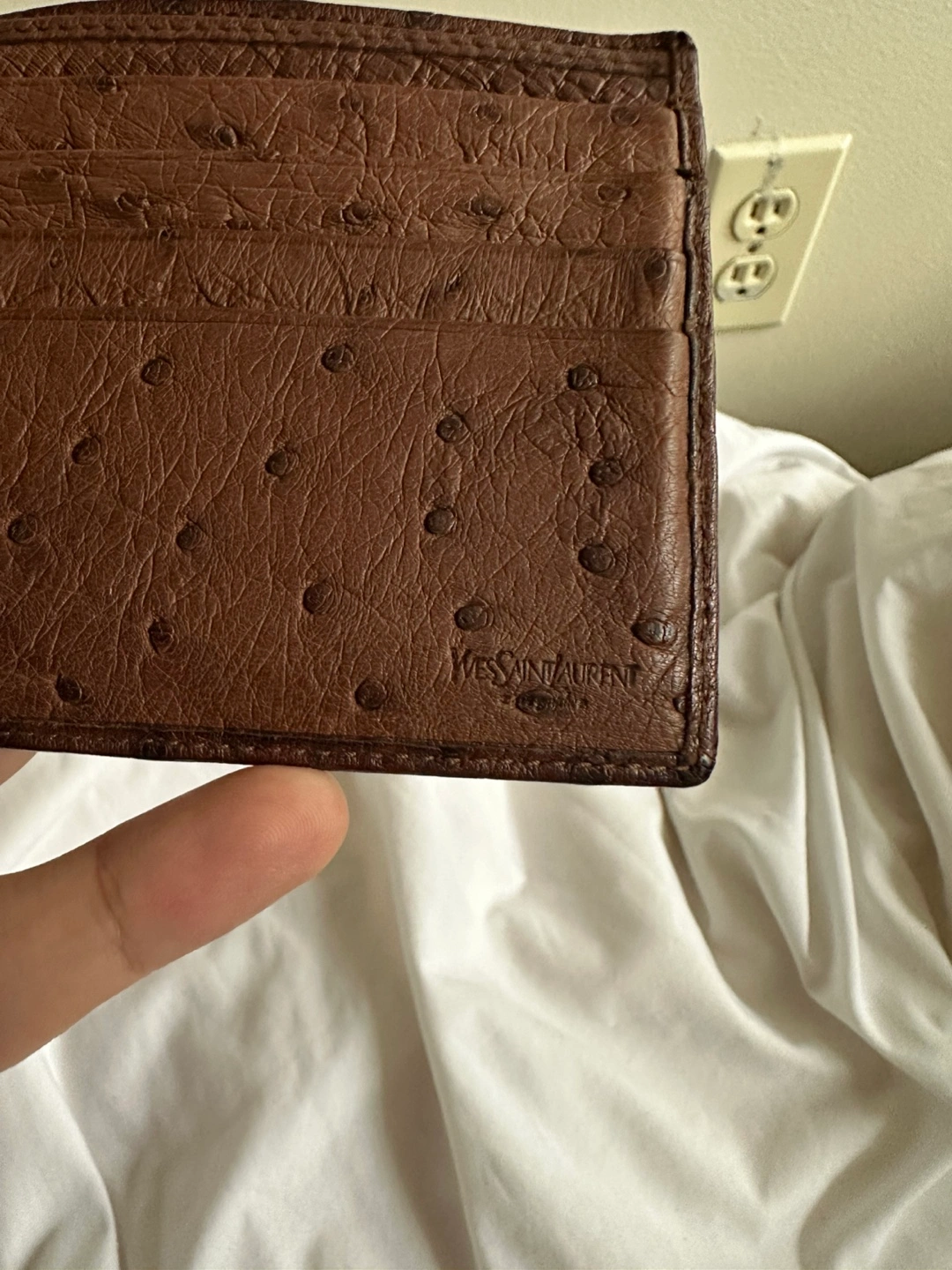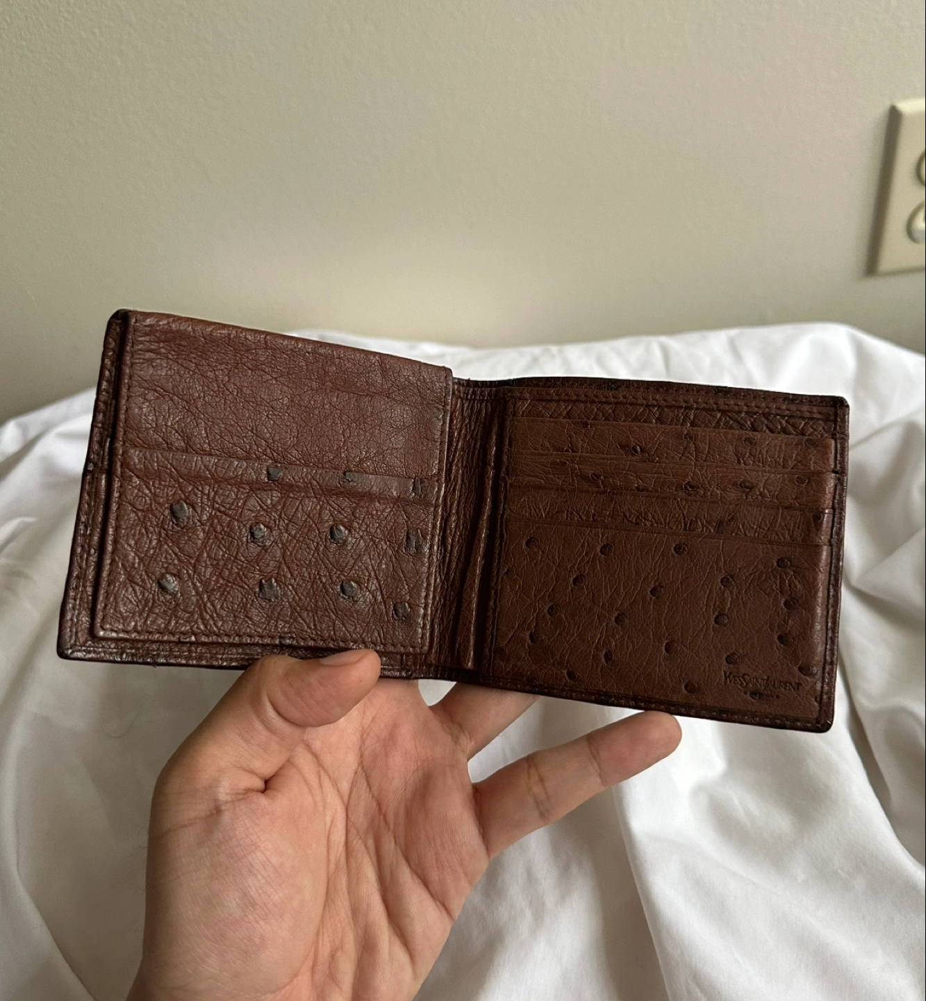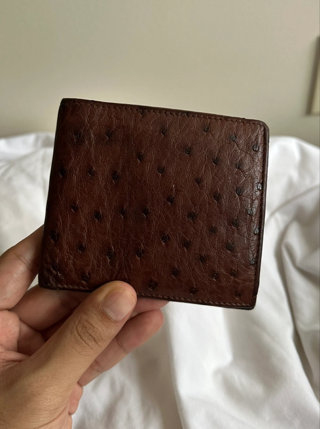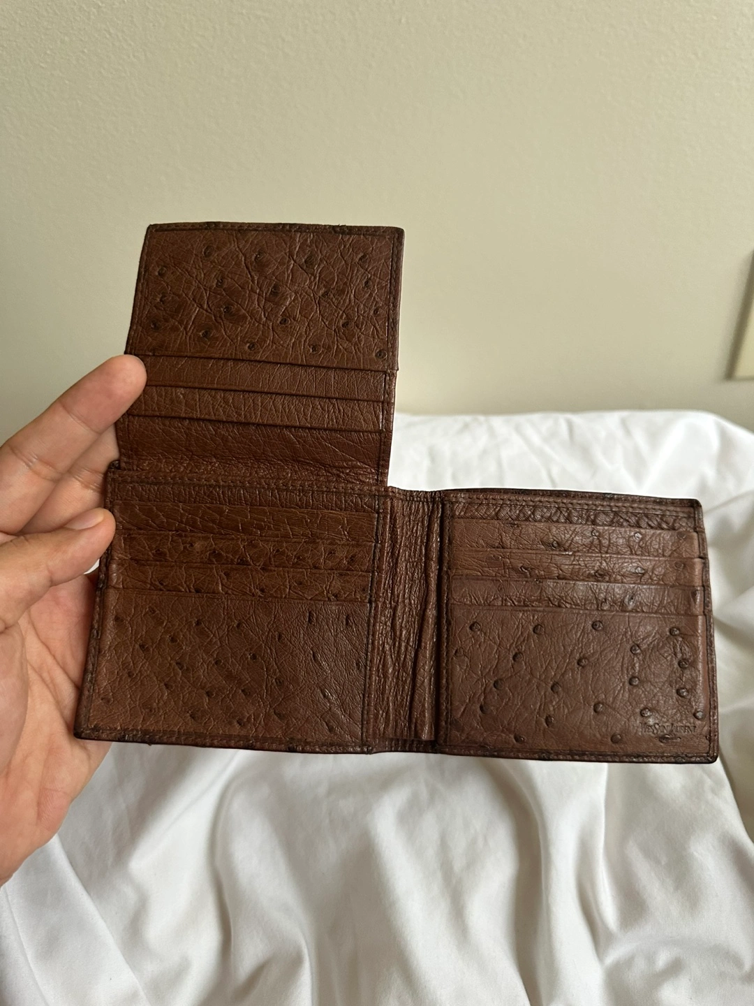 199Brown leather bi-fold wallet. Ostrich leather. Multiple card slots and bill compartments. Pristine condition