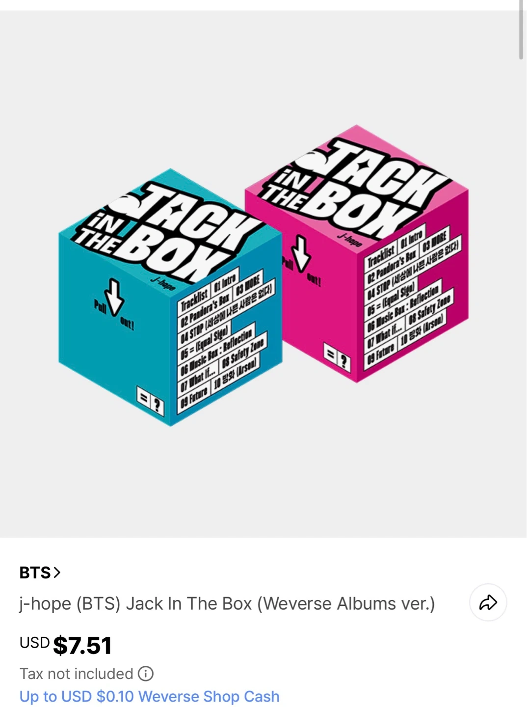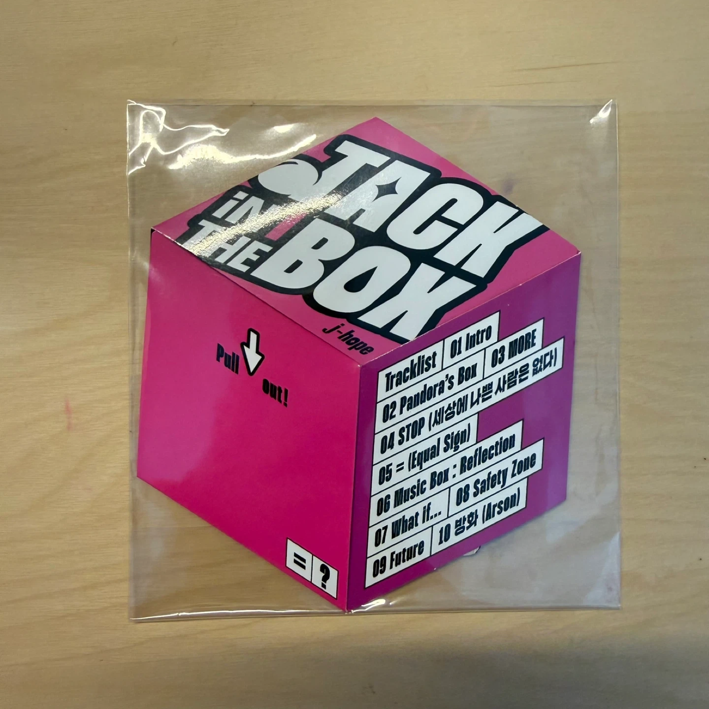 This is the Jack In The Box album by j-hope of BTS. It comes with a tracklist including Intro, Pandora's Box, MORE, STOP, Equal Sign, Music Box: Reflection, What If..., Safety Zone, and Future.