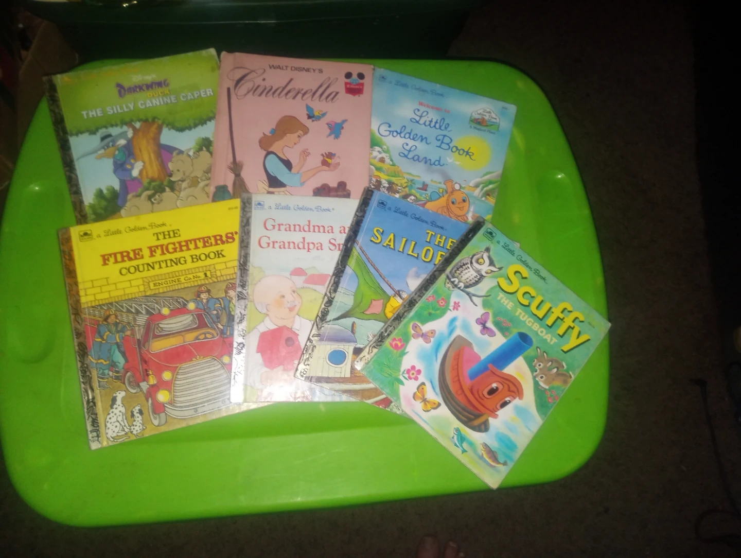 This set includes six classic Little Golden Books. Titles are 'Darkwing Duck: The Silly Canine Caper,' 'Walt Disney's Cinderella,' 'Little Golden Book Land,' 'The Fire Fighters' Counting Book,' 'Grandma and Grandpa,' 'Scuffy the Tugboat.' and the Sailor Dog.