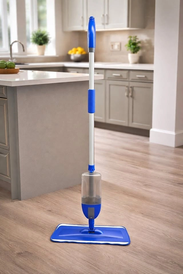 Lightweight spray mop with built-in refillable water tank. Similar to Swiffer style mops – just fill the tank with water or your preferred floor cleaner and spray as you go.