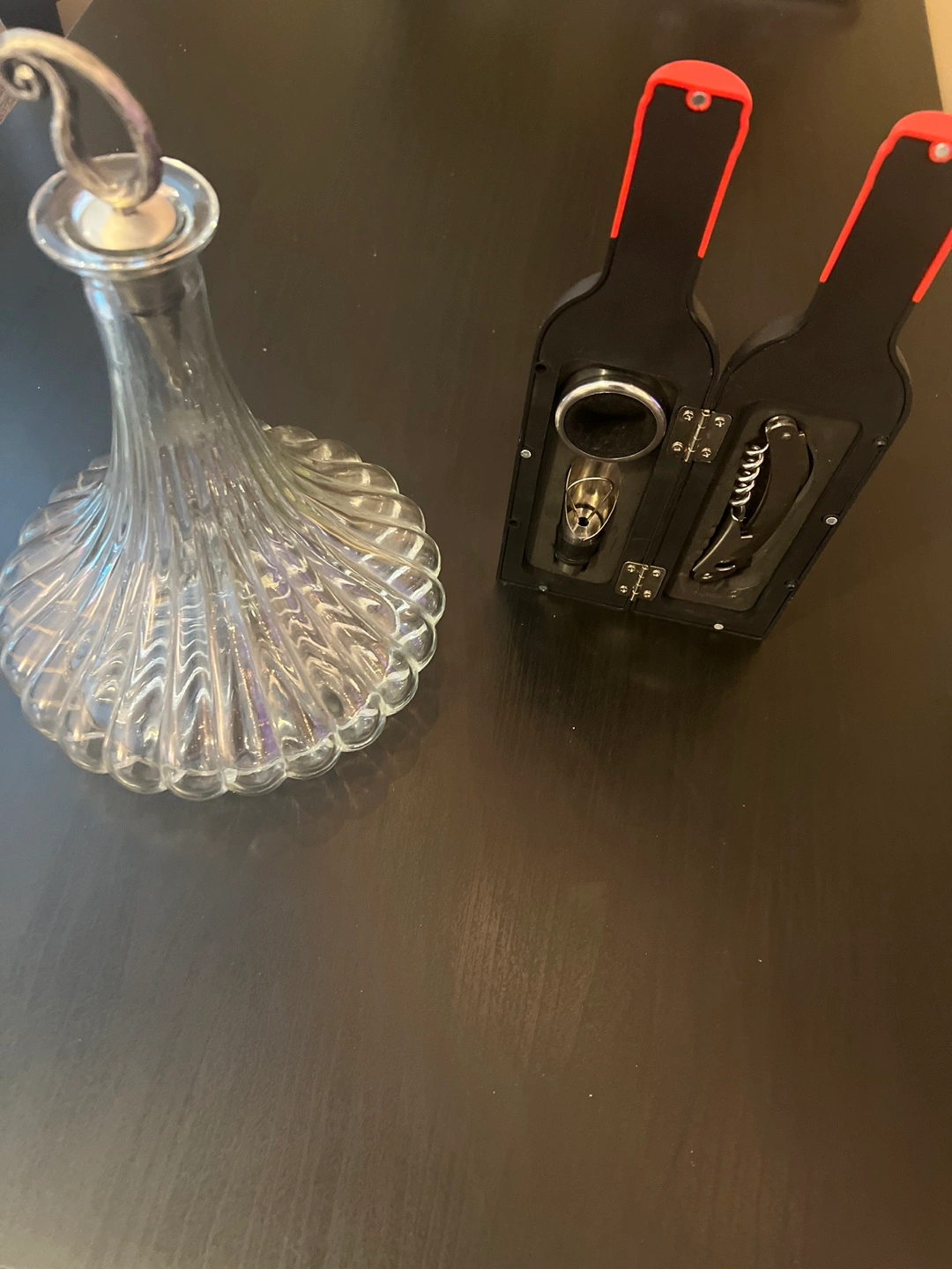 Elegant crystal wine decanter, features a unique fluted design and silver-toned stopper. Also includes a compact, two-bottle wine opener with various tools. Perfect for wine enthusiasts. $5 each