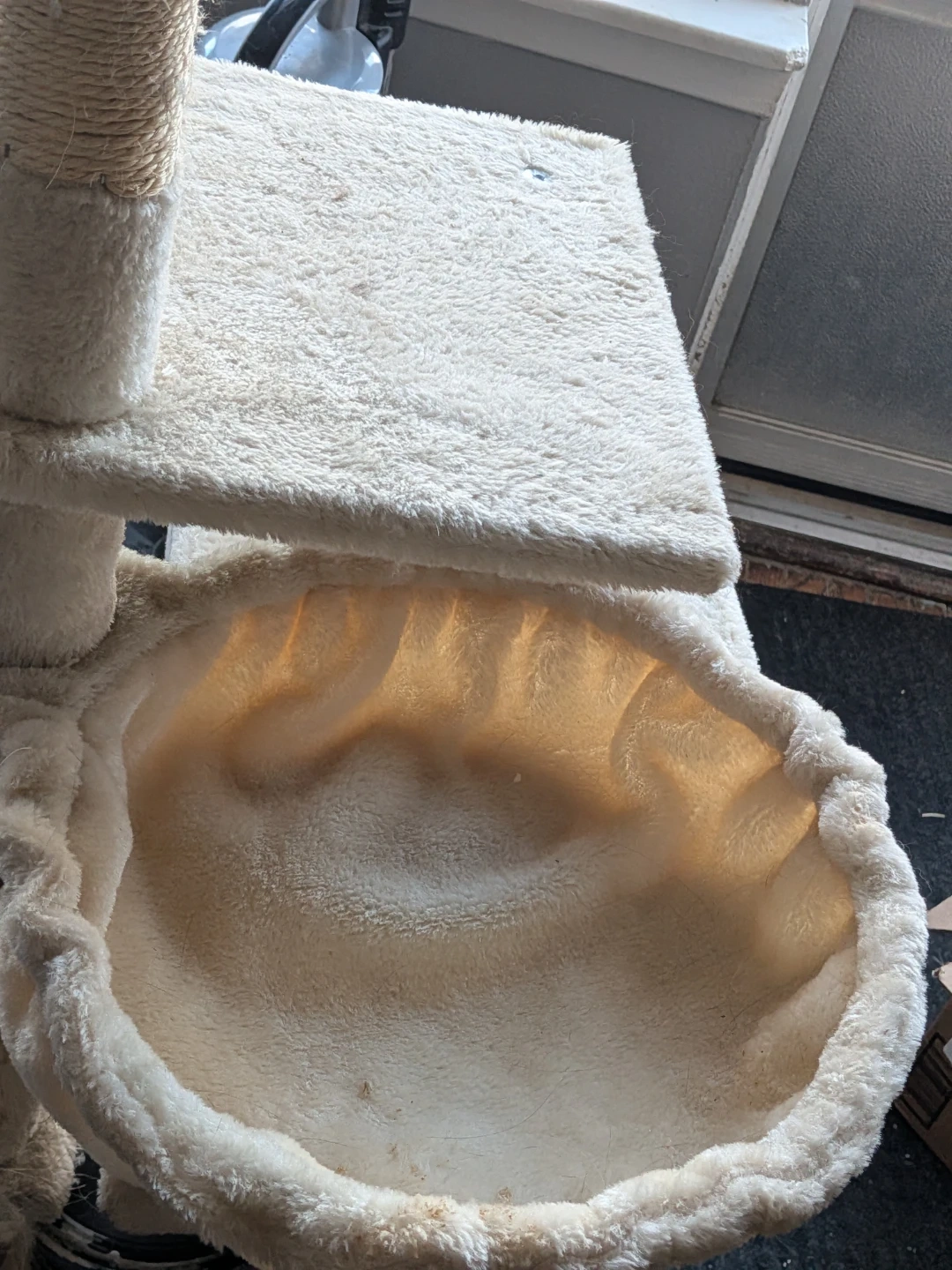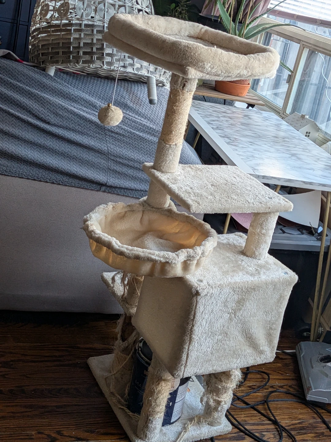 Needs re ropeing, cats have destroyed rope on some posts. Also, my cat knocks the entire tree over so have to put something heavy to secure in place. Sold AS IS