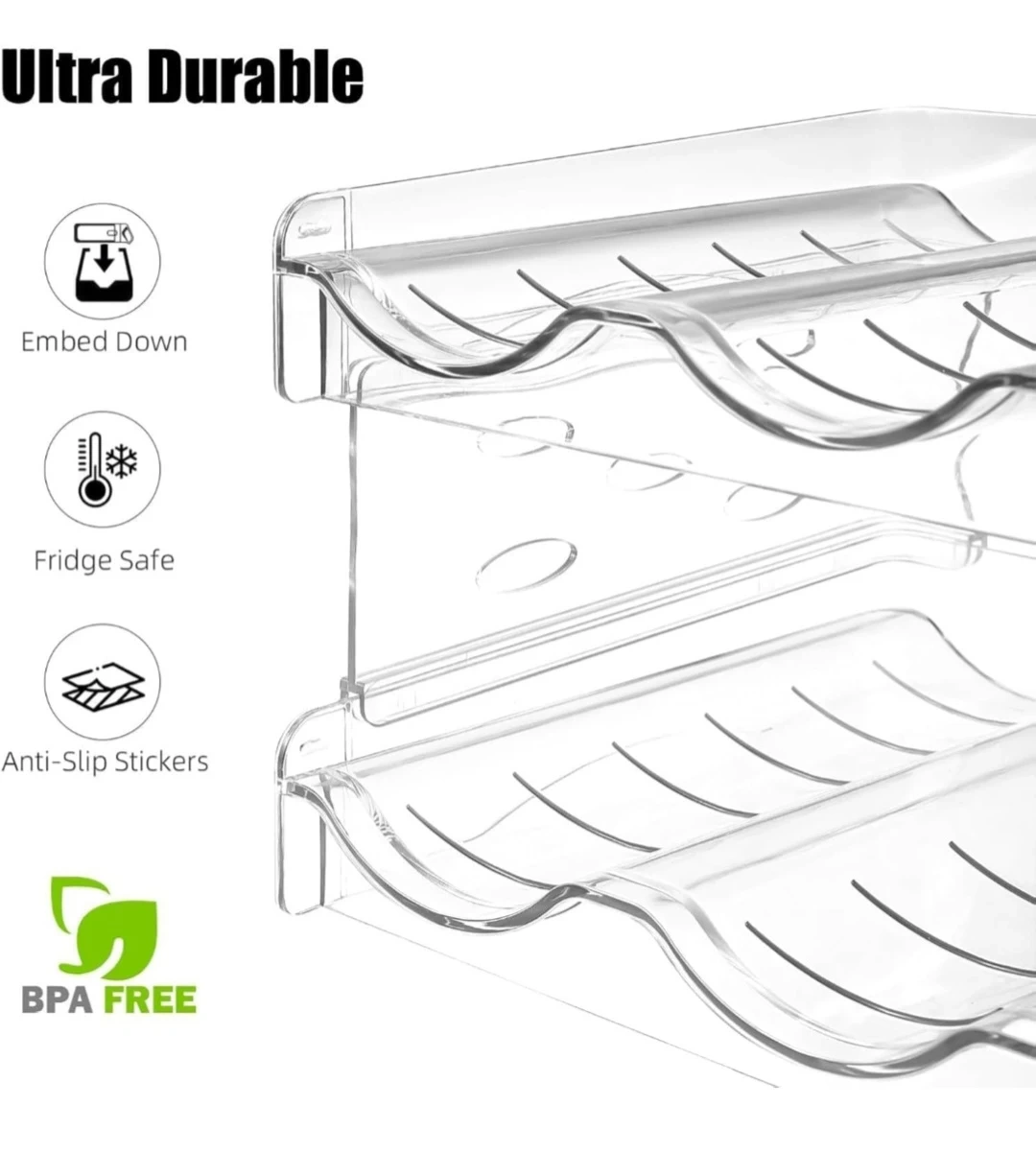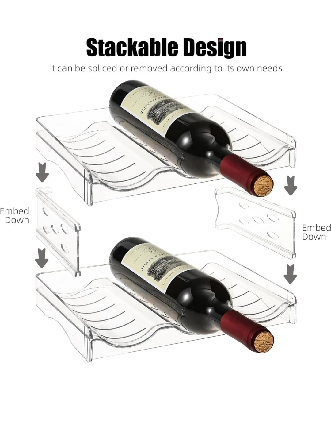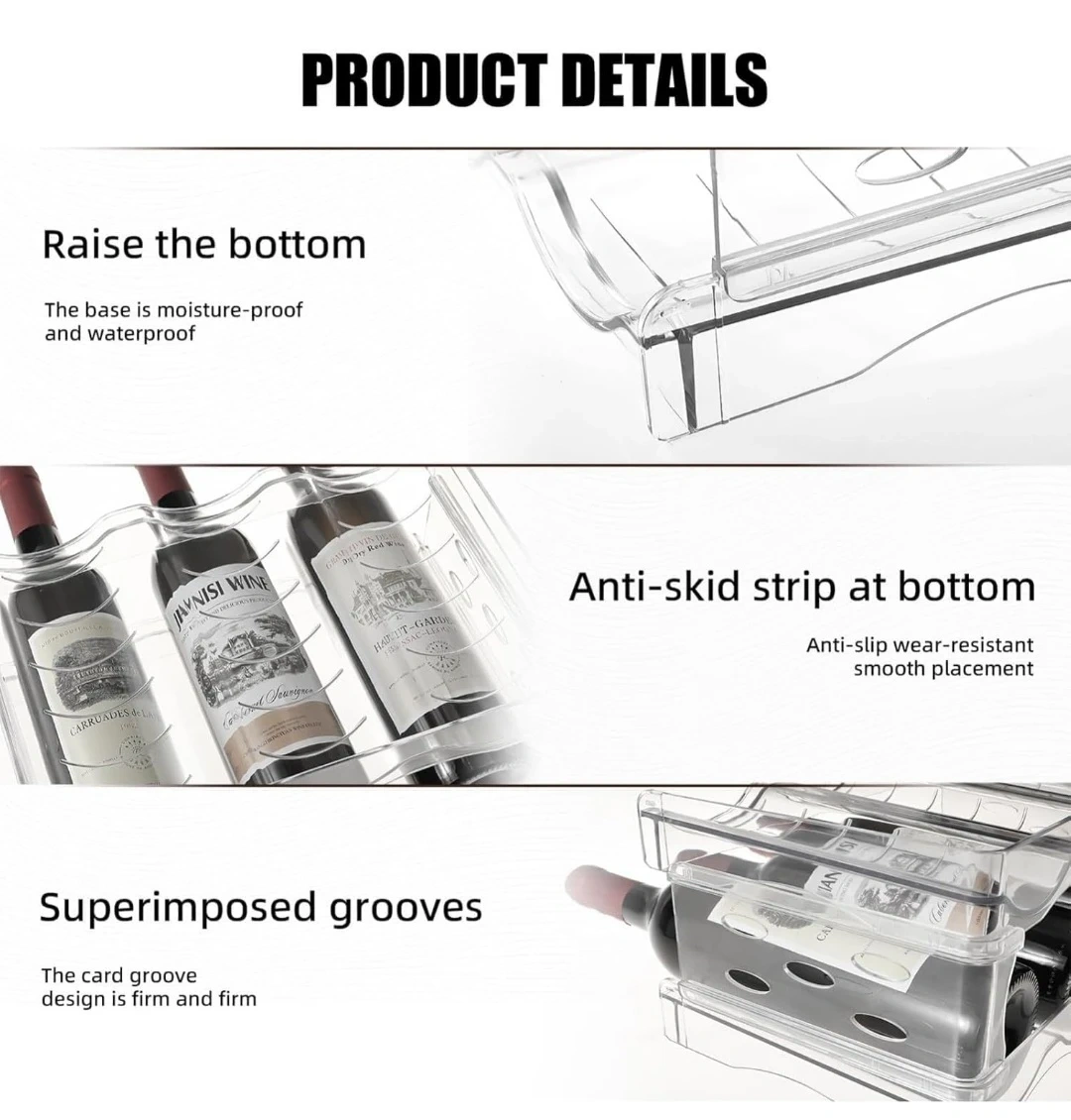 Stackable clear plastic wine/water bottle rack. Each layer holds three bottles for a total of twelve bottles when fully assembled. Made from durable, drop-resistant plastic. Features a stable structure and anti-skid strips on the bottom. Perfect for organizing wine bottles in your home!