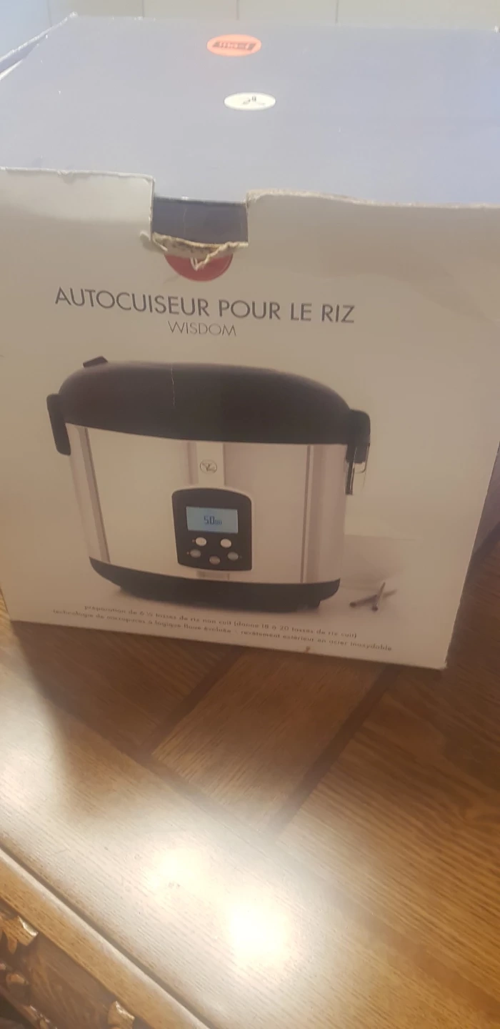 This is a Wisdom "Autocuiseur pour le riz" rice cooker. It's designed to cook up to 10 cups of rice. The display shows 50 minutes, likely for a cooking cycle.