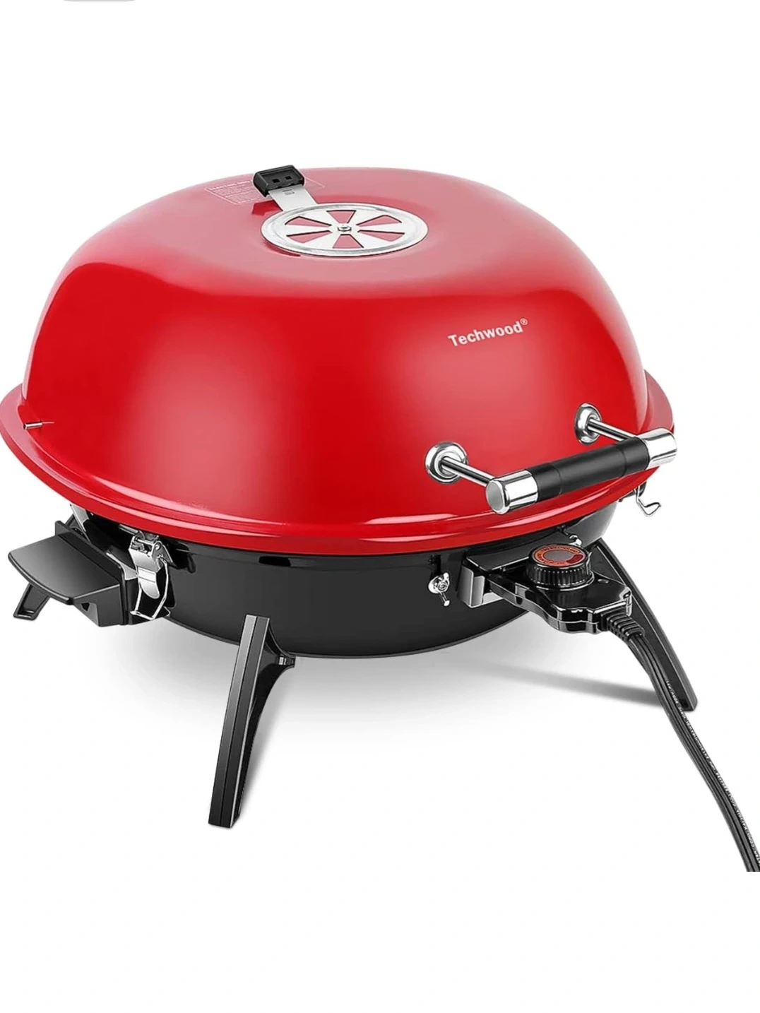 This is a red Techwood electric grill. It features adjustable temperature control and a removable cord. Includes a lid with a vent for optimal cooking. Great for balconies or small spaces!