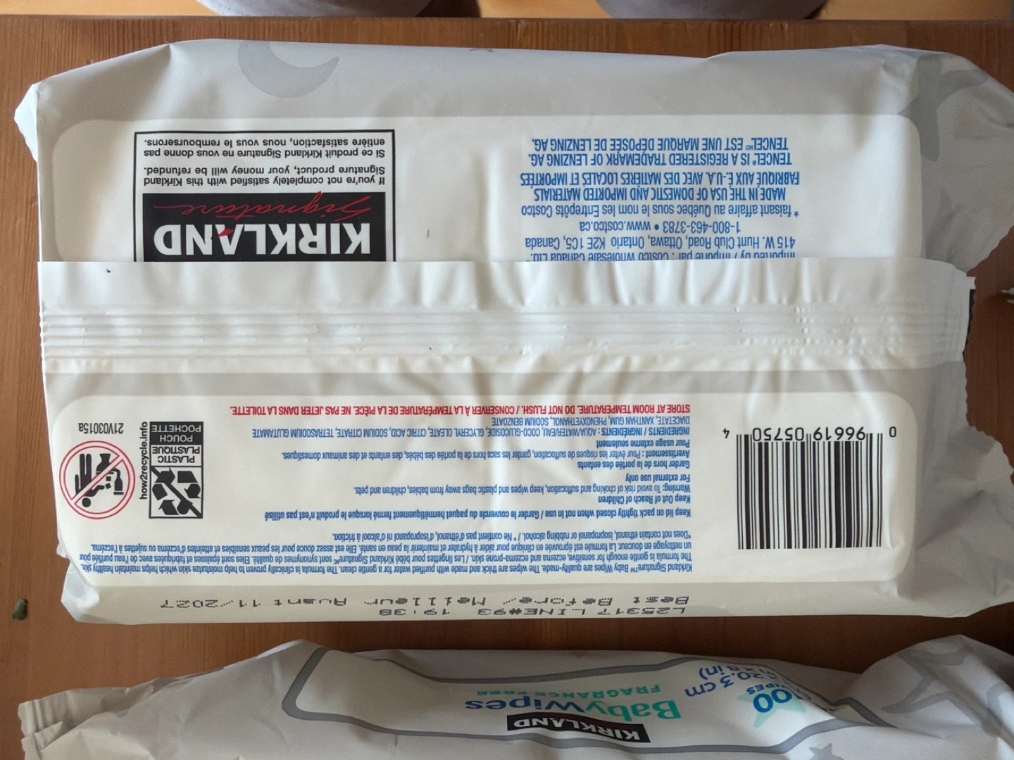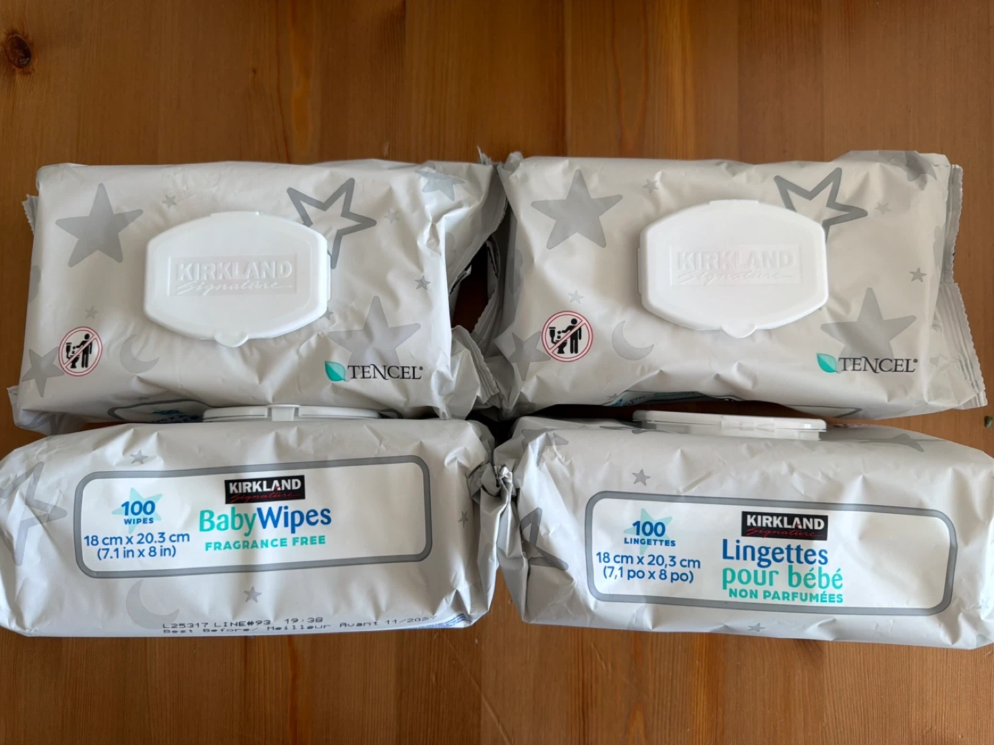 Four packs of Kirkland Signature baby wipes, each containing 100 unscented wipes. They measure 18 cm x 20.3 cm (7.1 in x 8 in). Made with Tencel for sensitive skin. Best before November 2027.