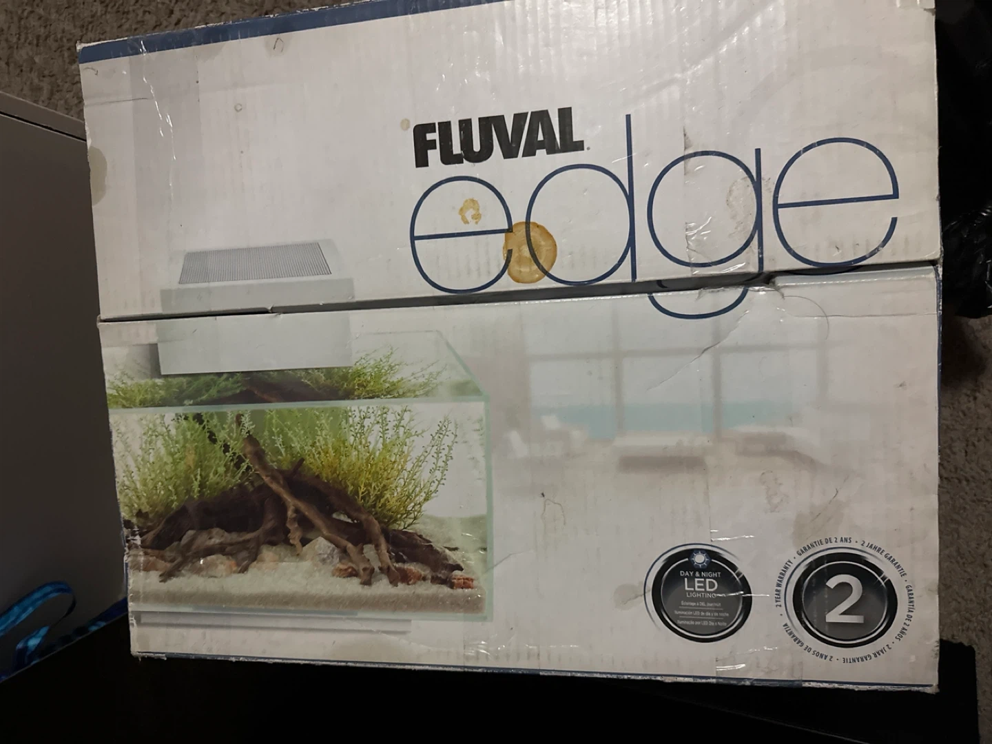 Fluval Edge aquarium featuring day and night LED lighting. It's a sleek, modern tank with a built-in filtration system. This setup is perfect for small fish or shrimp!
