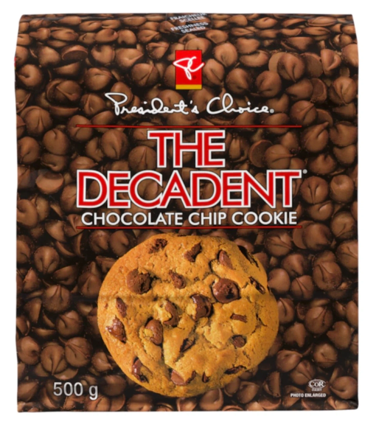 President's Choice The Decadent chocolate chip cookies are a delicious treat. This package contains 500g of cookies. These cookies are perfect for enjoying with a glass of milk!