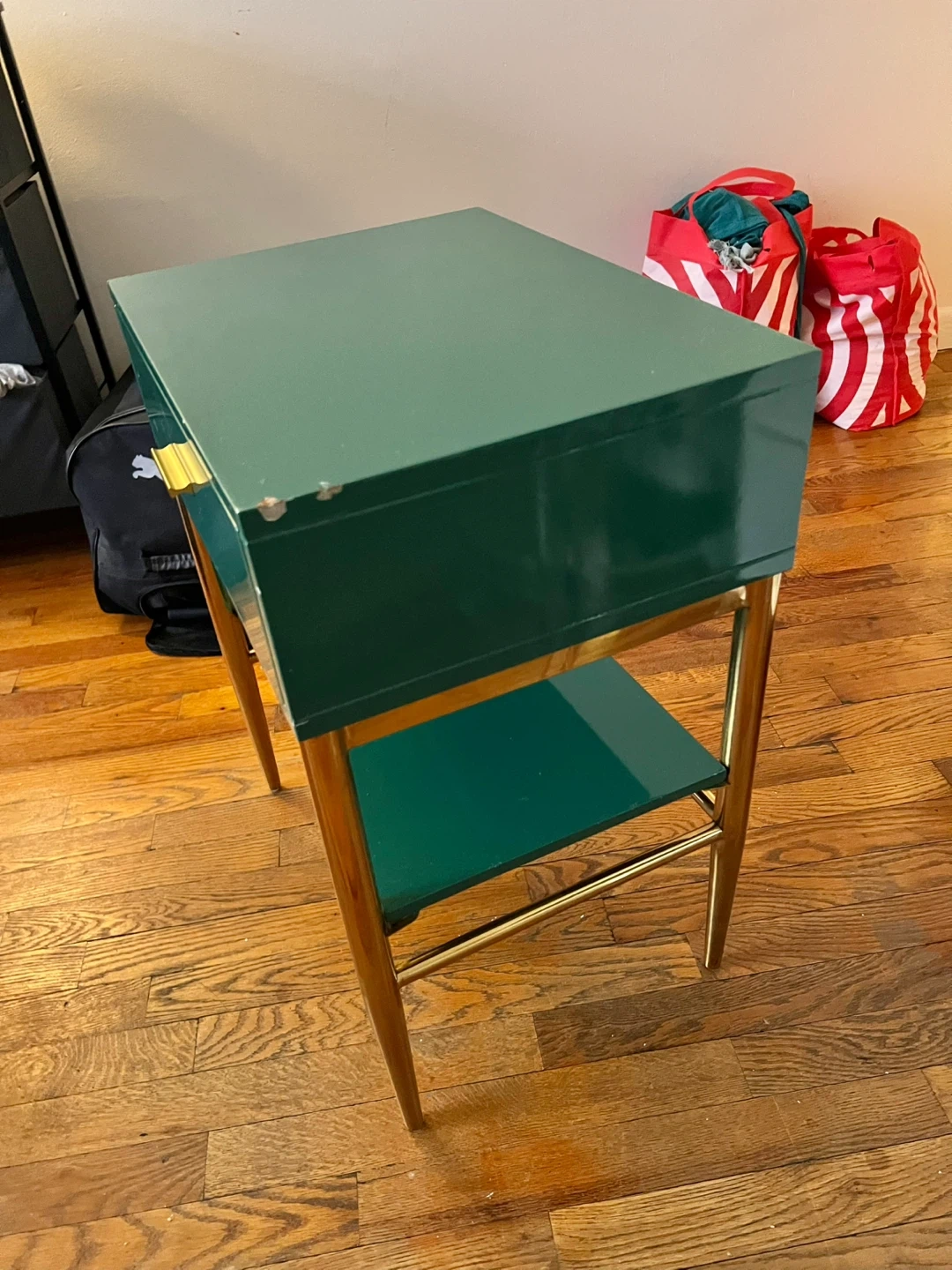 Green lacquered end table with a single drawer and a lower shelf. Features gold-toned hardware and tapered legs. Some minor scuffs on the top surface. Wood interior drawer.
