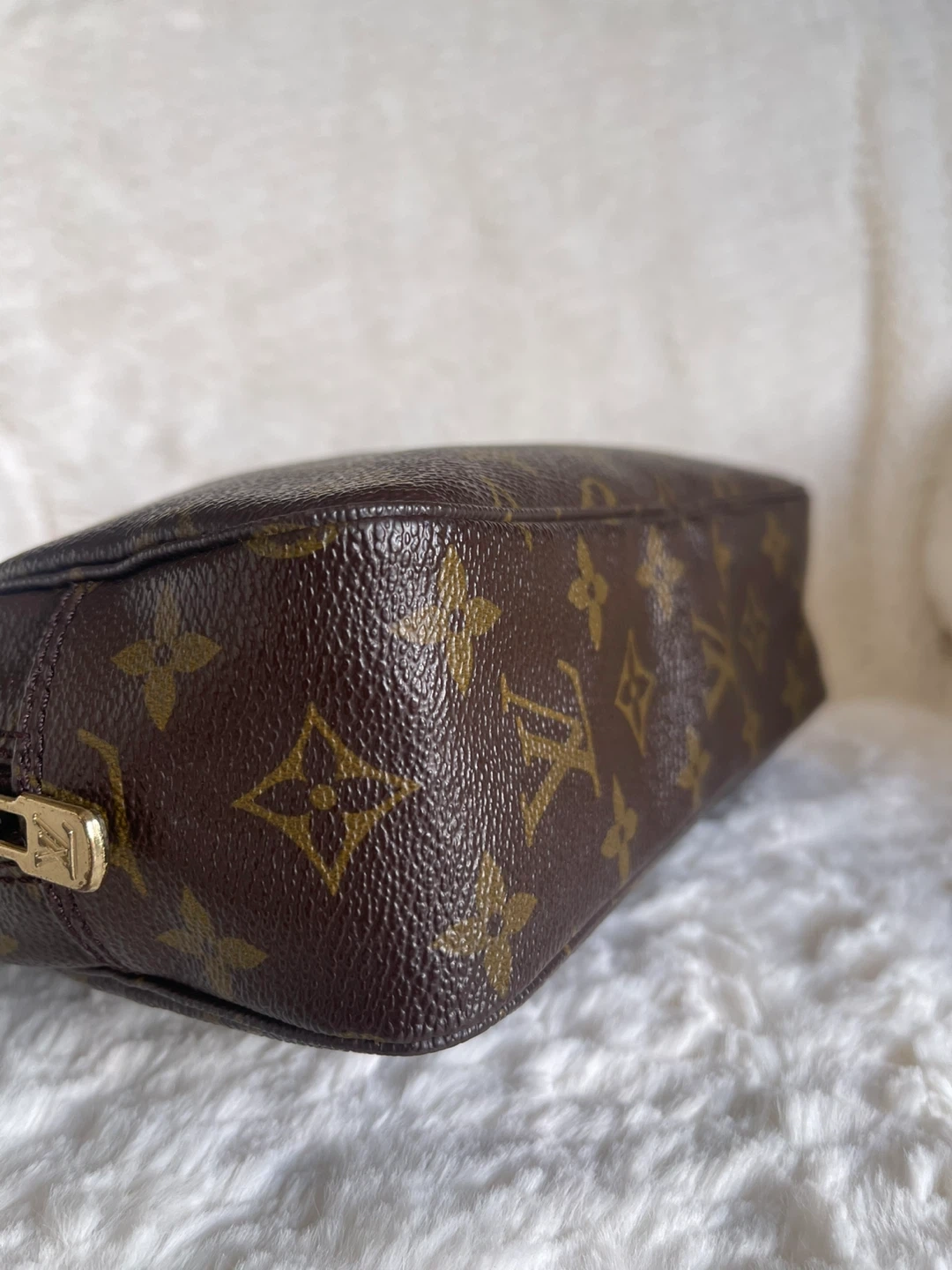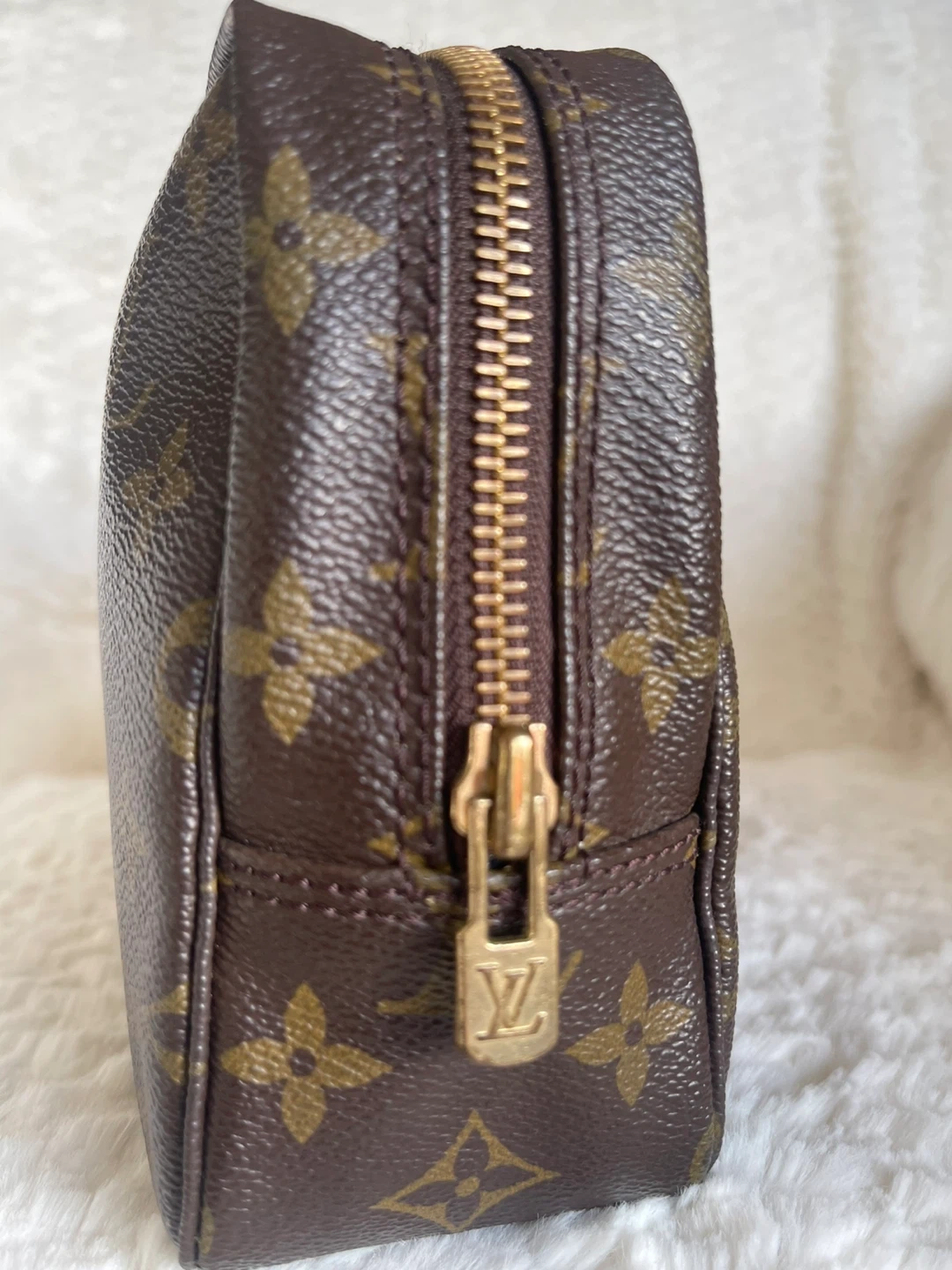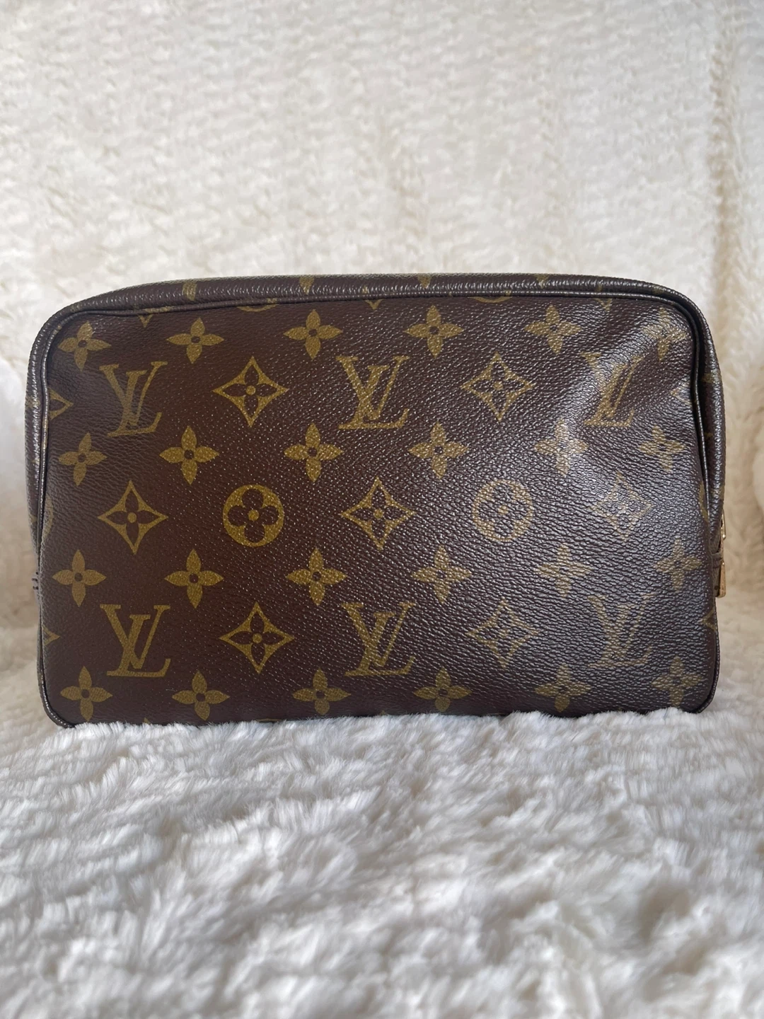 This is a Louis Vuitton monogram toiletry pouch. It's made from the brand's signature coated canvas with gold-tone hardware. The zippered closure provides secure storage for your essentials. It's a versatile accessory for travel or everyday use!