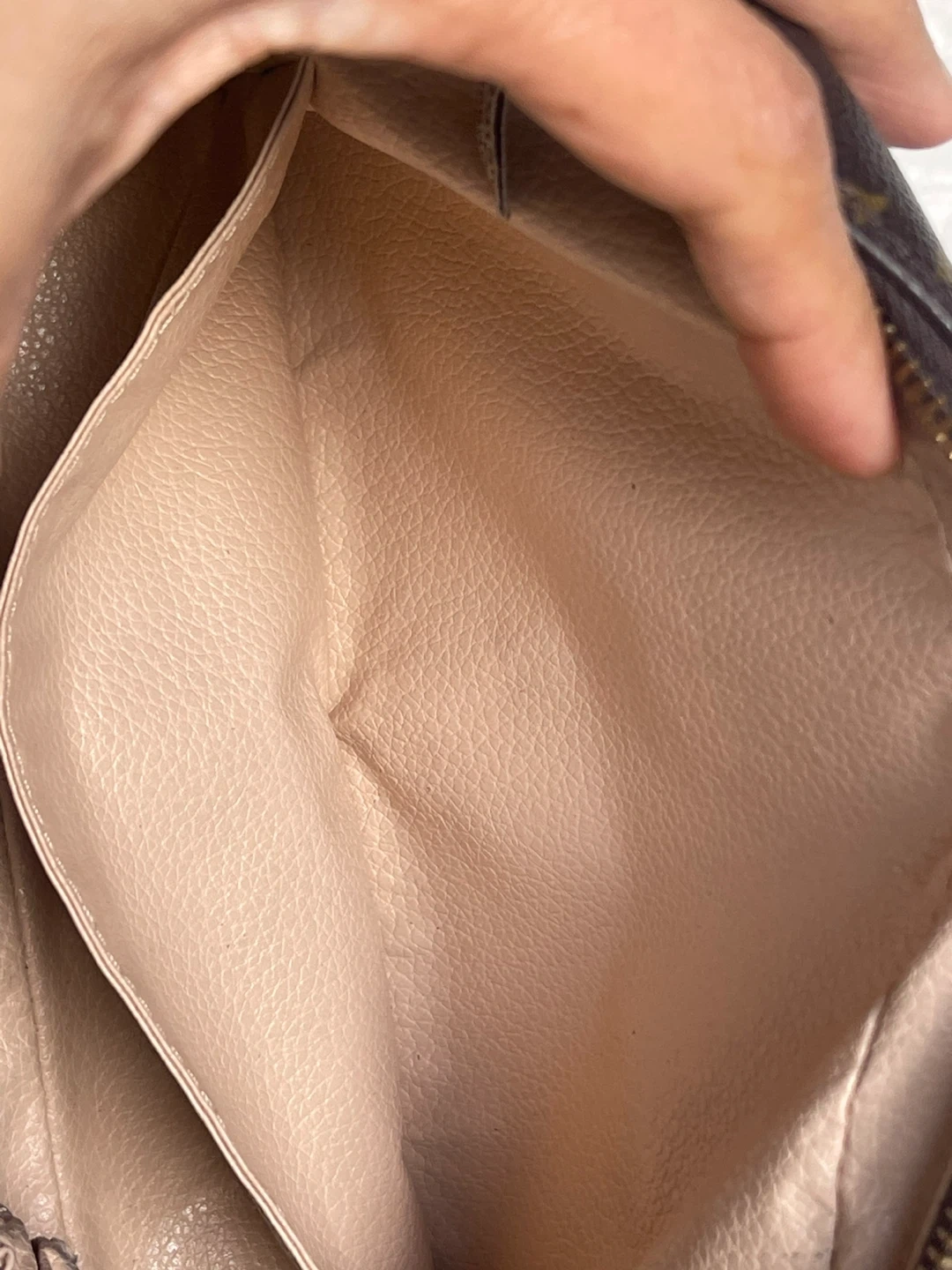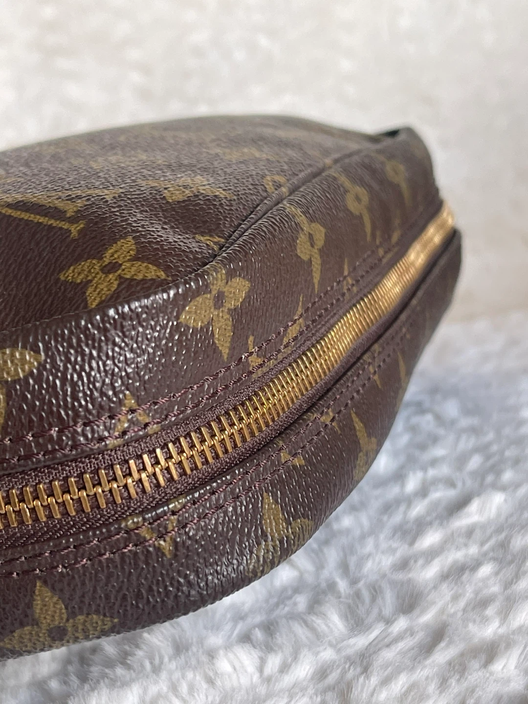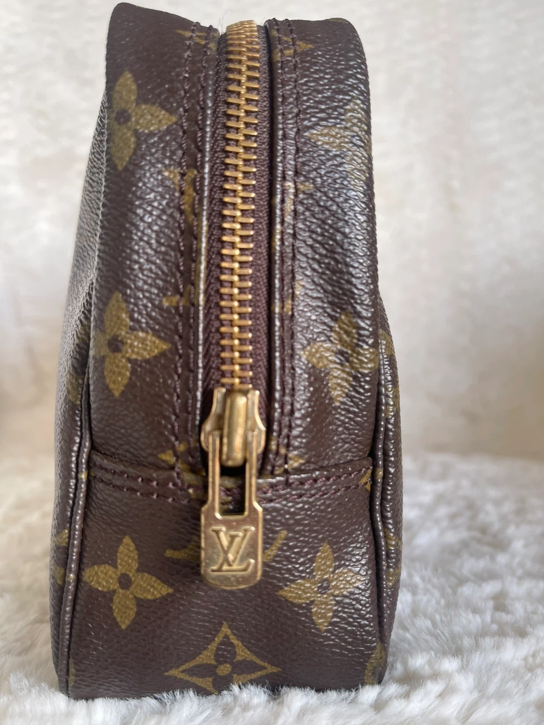 This is a Louis Vuitton monogram toiletry pouch. It's made from the brand's signature coated canvas with gold-tone hardware. The zippered closure provides secure storage for your essentials. It's a versatile accessory for travel or everyday use!