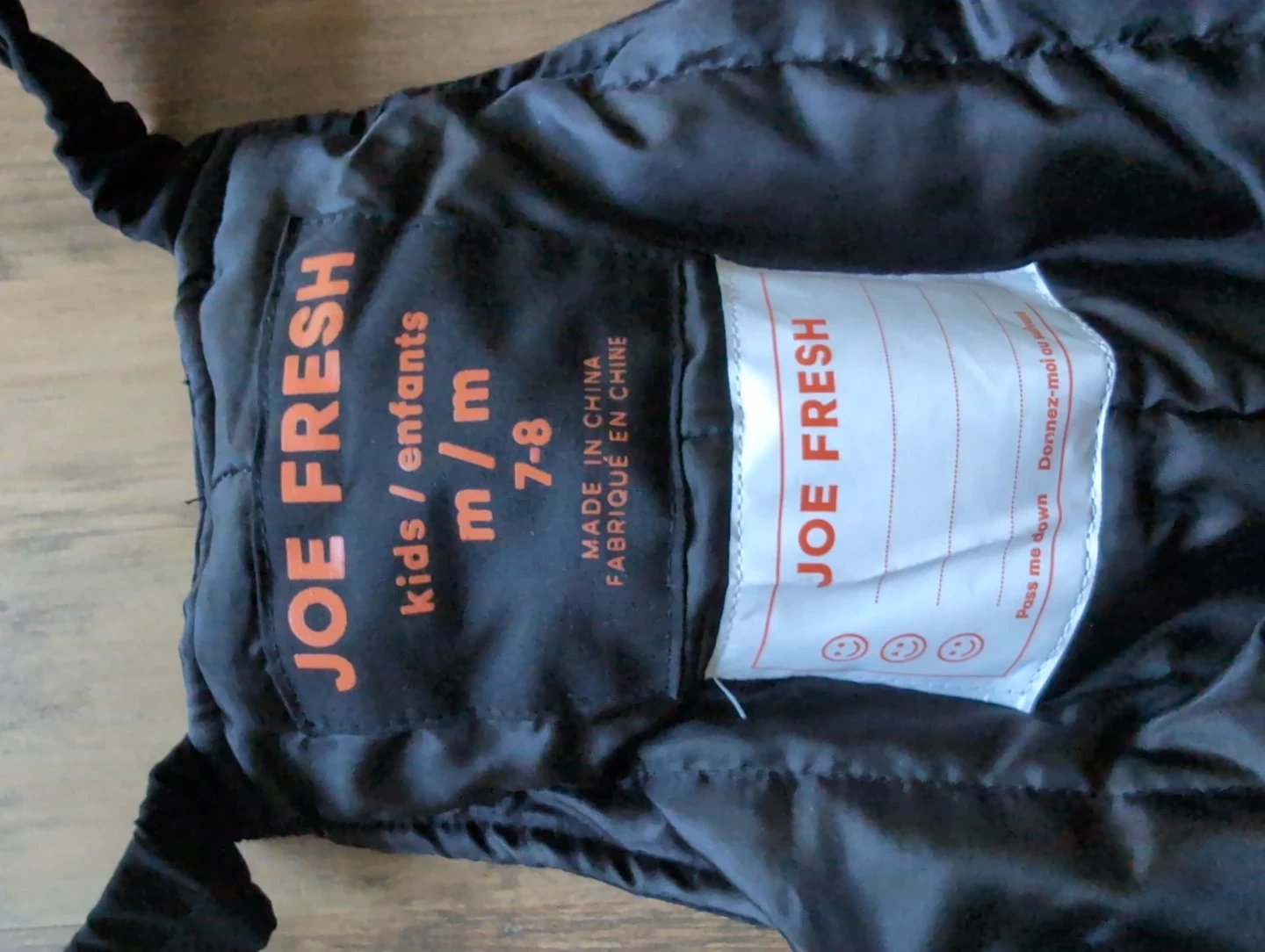 Brand new black snow pants from Joe Fresh for kids. Size medium, fits ages 7-8. Zipper front with adjustable straps.