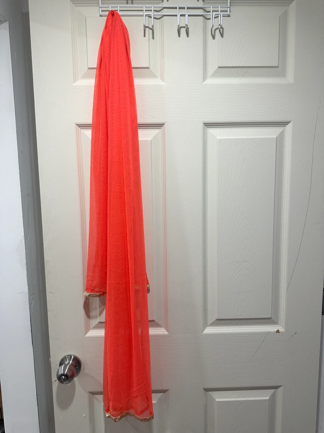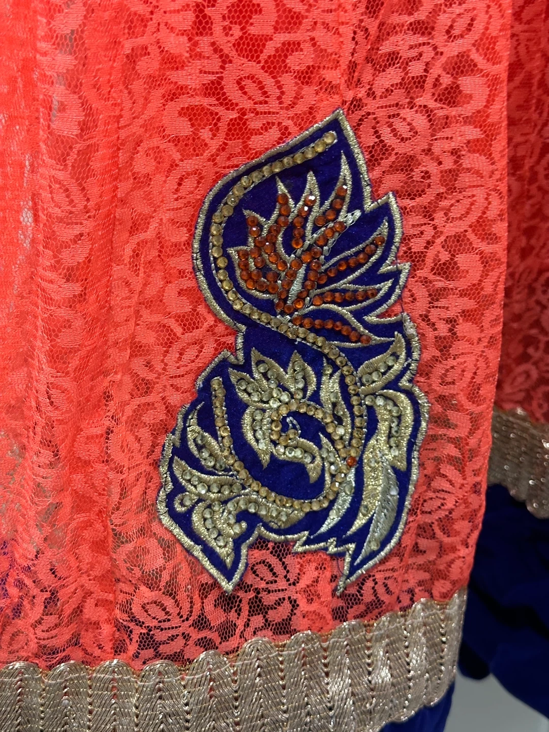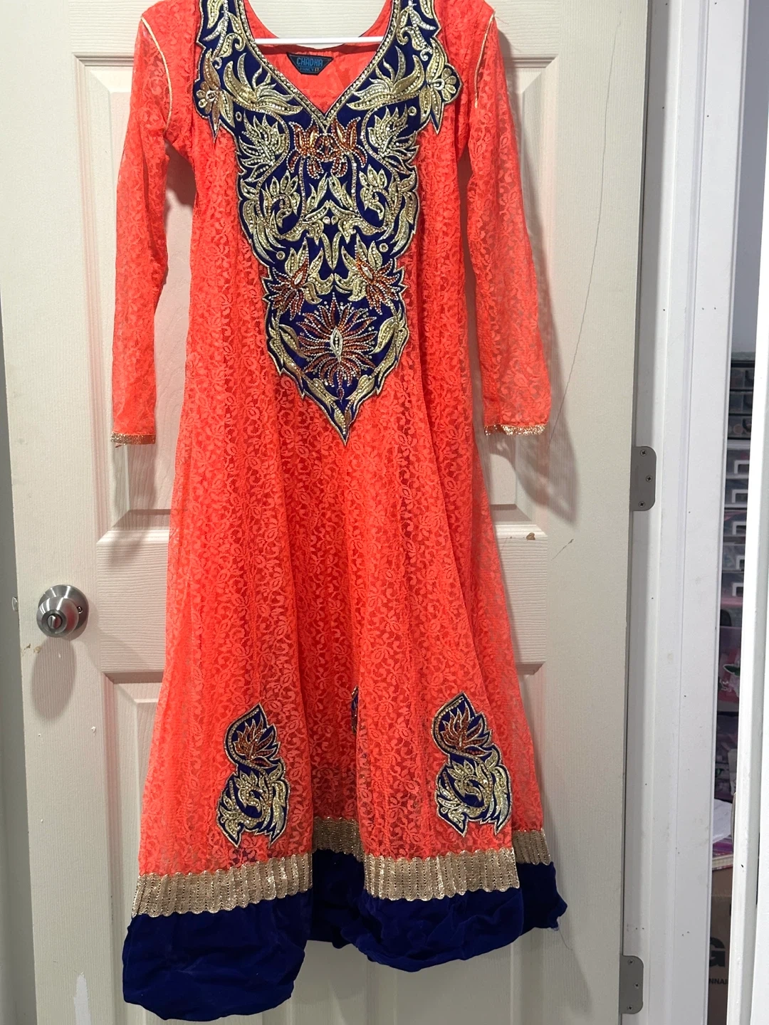 Beautiful coral coloured Anarkali dress with blue and gold embroidery. The dress features a lace overlay and is perfect for special occasions or cultural events. It's in great condition and ready for a new home! Please let me know if you require the measurements; I would be glad to provide them. Price is negotiable.