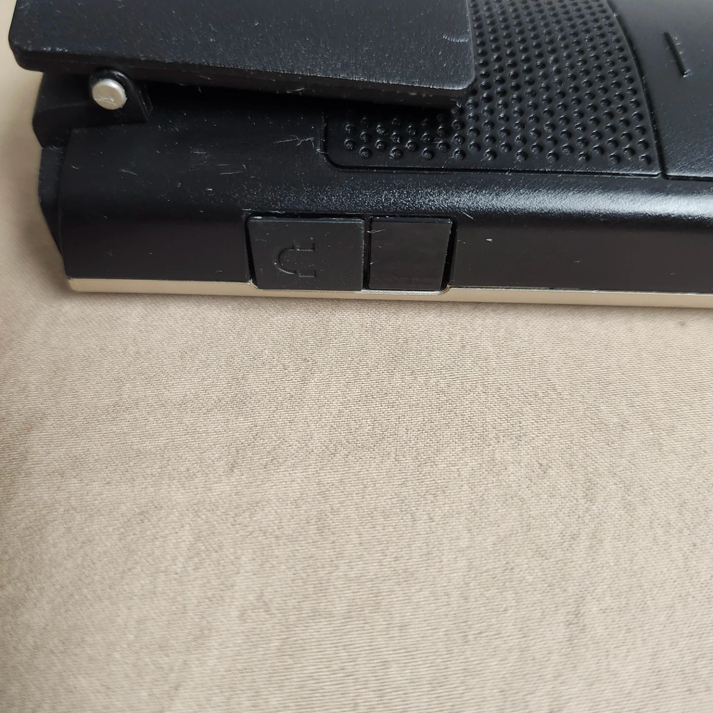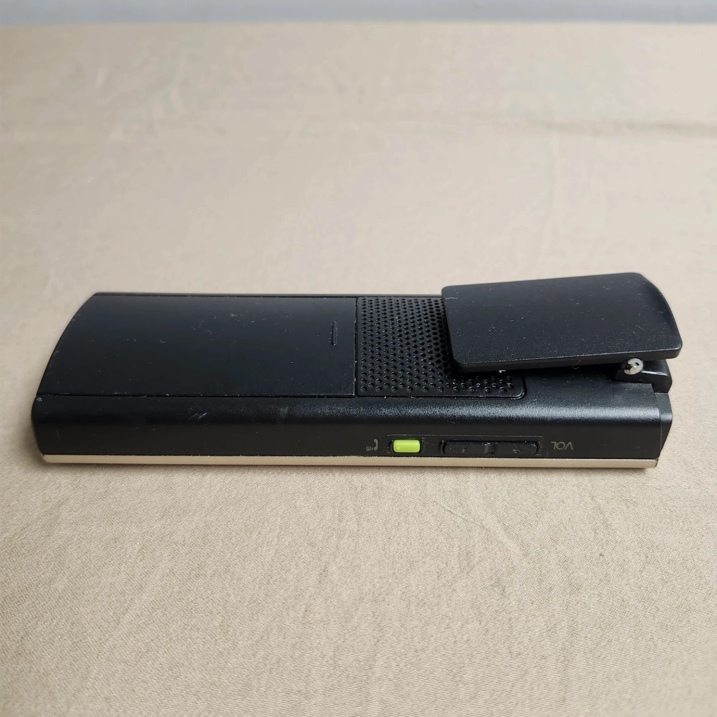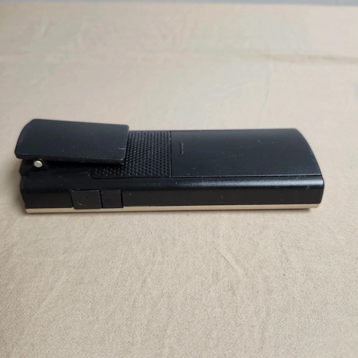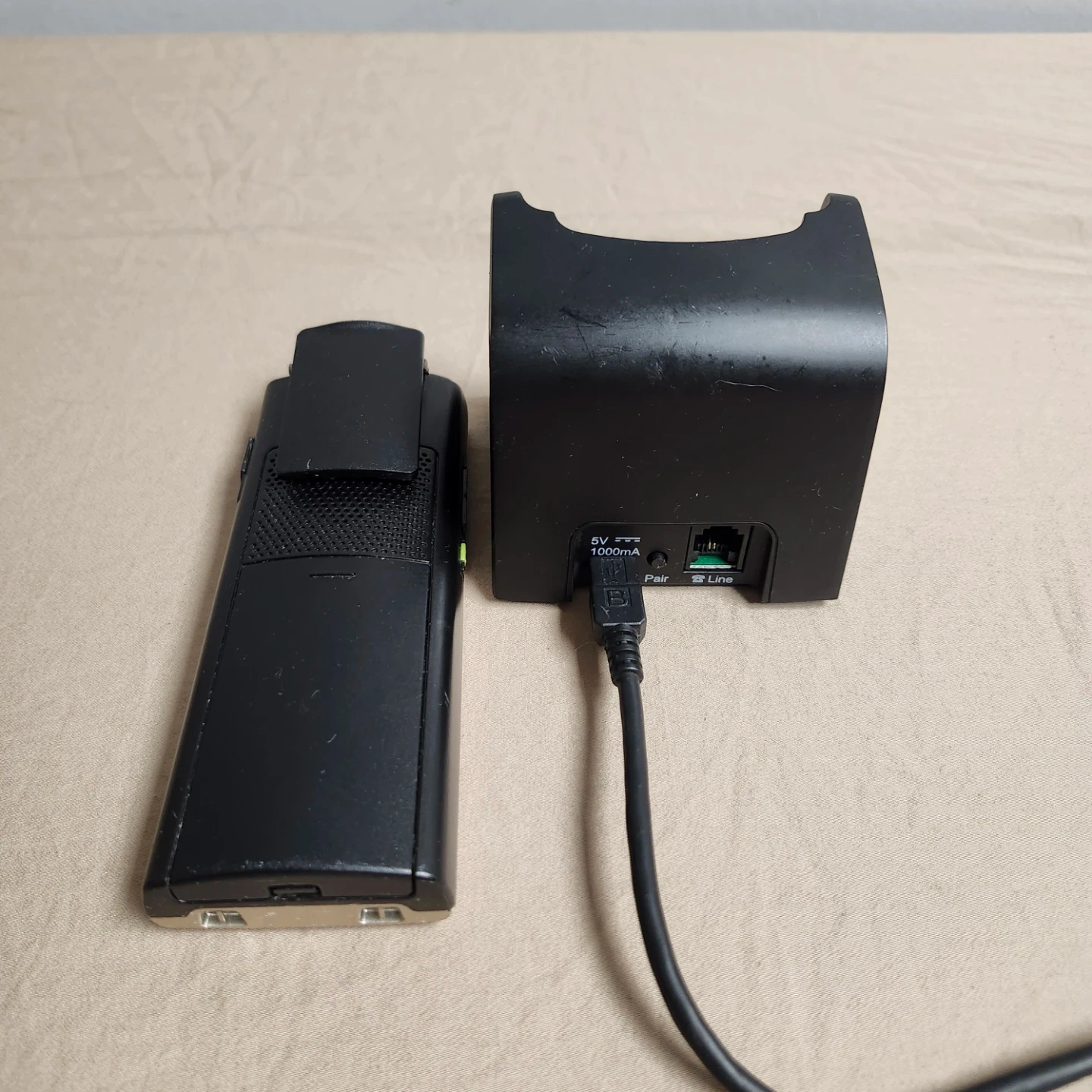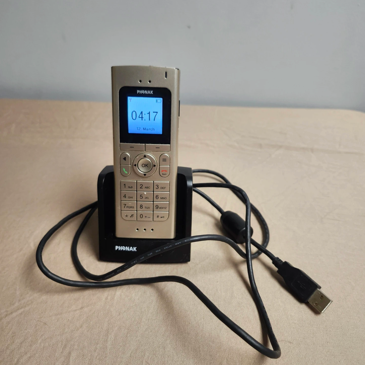 This is a Phonak cordless phone with its charging dock. The phone is gold and the dock is black. It's a handy device for your home or office. Connects to Phonak hearing aids.