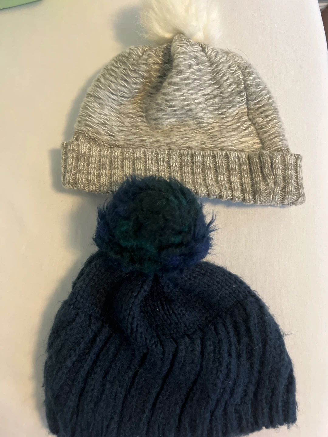 Selling two knitted hats! One is a dark blue with a pompom, and the other is a grey knit. Both are in good condition and ready to keep you warm this winter