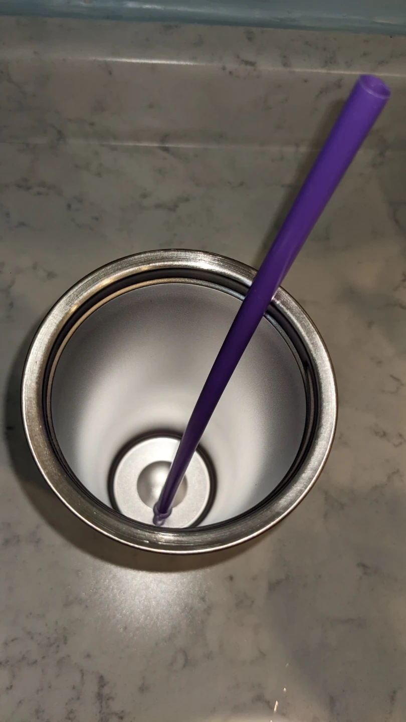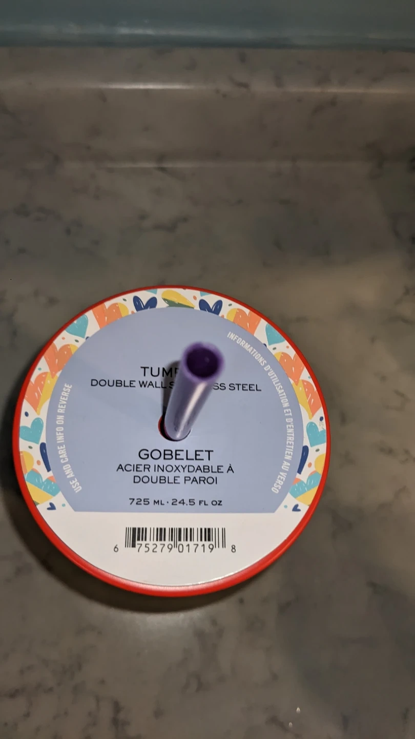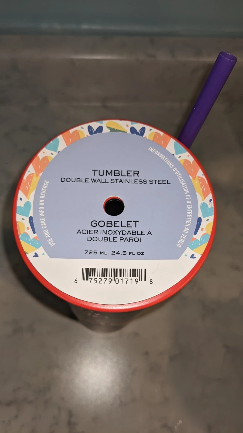 This double-wall stainless steel tumbler holds 725 mL or 24.5 fl oz. It comes with a purple reusable straw. The tumbler's exterior features a rainbow design.