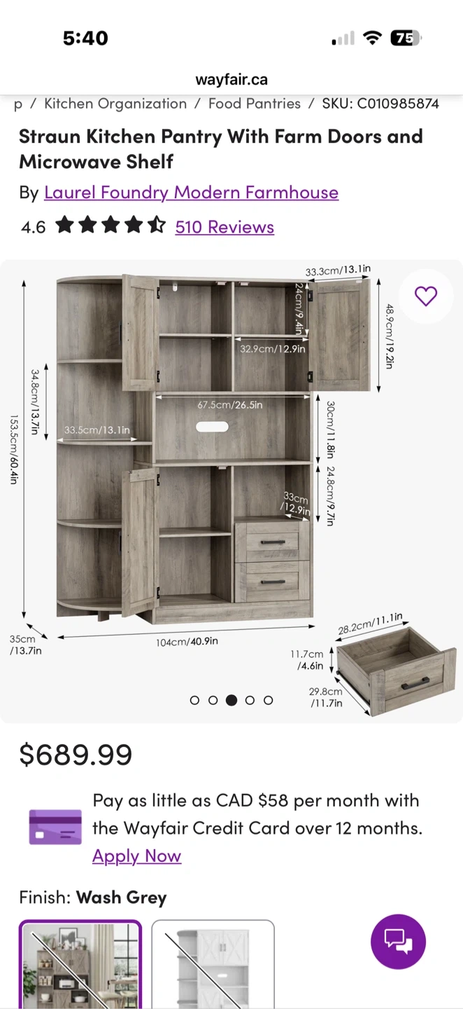 This kitchen pantry has farm doors and a microwave shelf. It Includes a drawer and multiple shelves for storage. Last picture is from the Wayfair site with the dimensions.