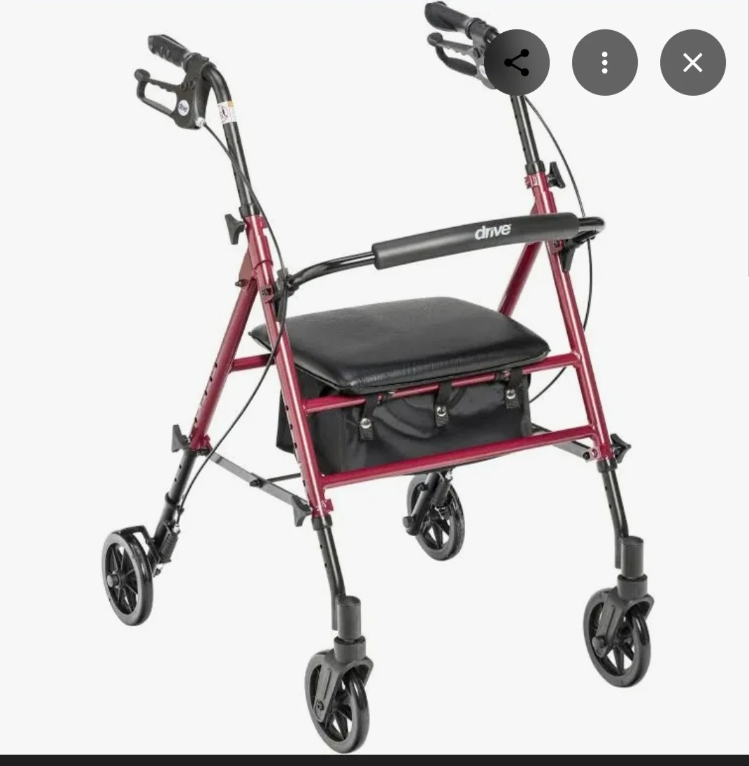 This Drive Medical four-wheel walker is a burgundy red colour. It comes with a padded seat and a storage bag underneath. The walker has easy-grip handles and lockable brakes for added safety. It's great for mobility assistance!