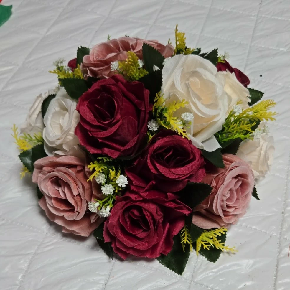 10 beautiful artificial floral ball arrangement features a mix of roses and greenery. It's great for decorating tables or event spaces. The arrangement includes various shades of roses, from deep red to soft pink and cream.