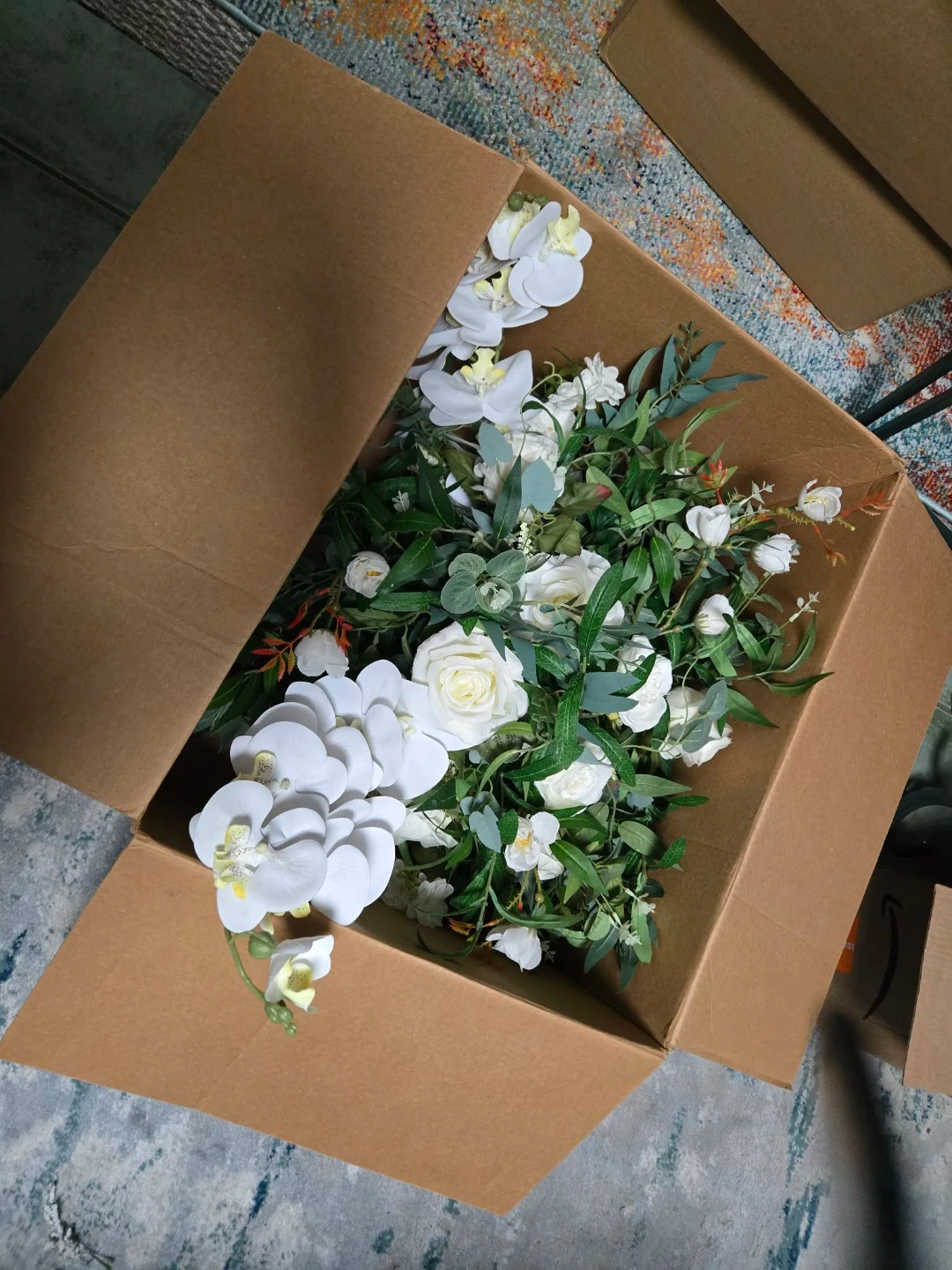 2 beautiful, large, white floral centerpieces. All white but I added some colour at my wedding.