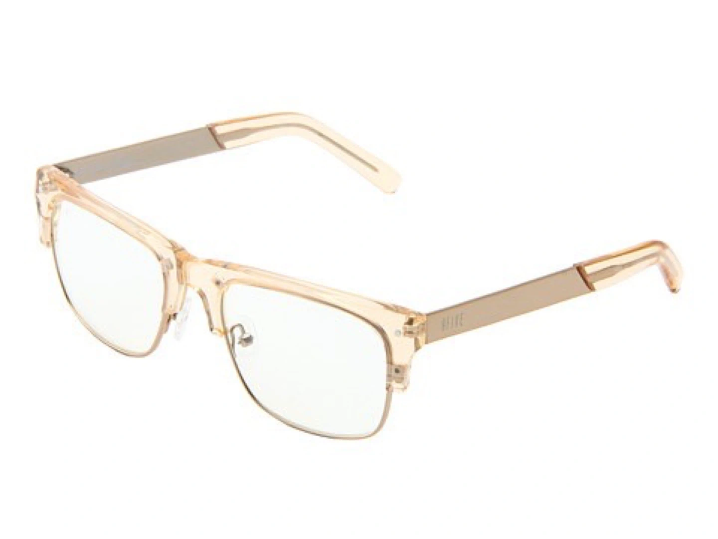 These eyeglasses feature a clear gold-hued frame with gold-tone metal accents on the temples. The rectangular shape offers a modern look. They're lightweight and comfortable for all-day wear.