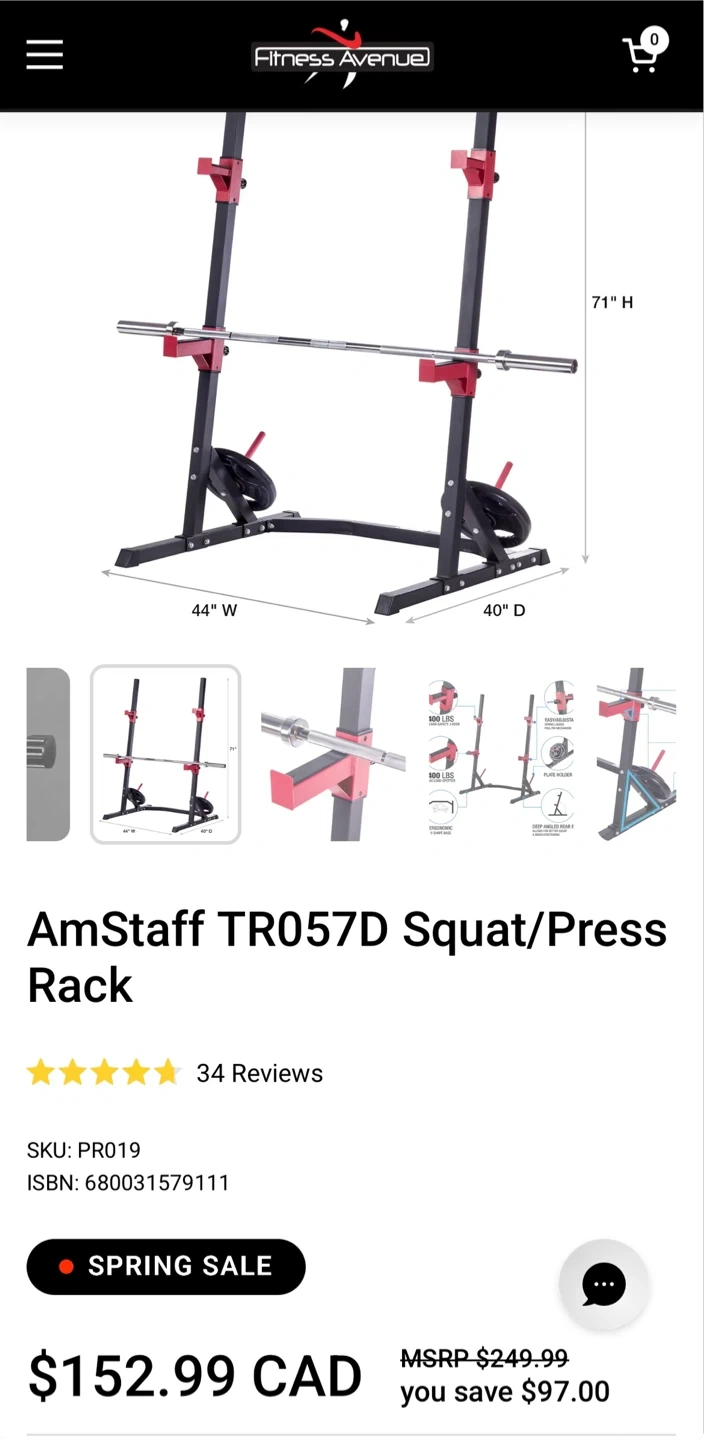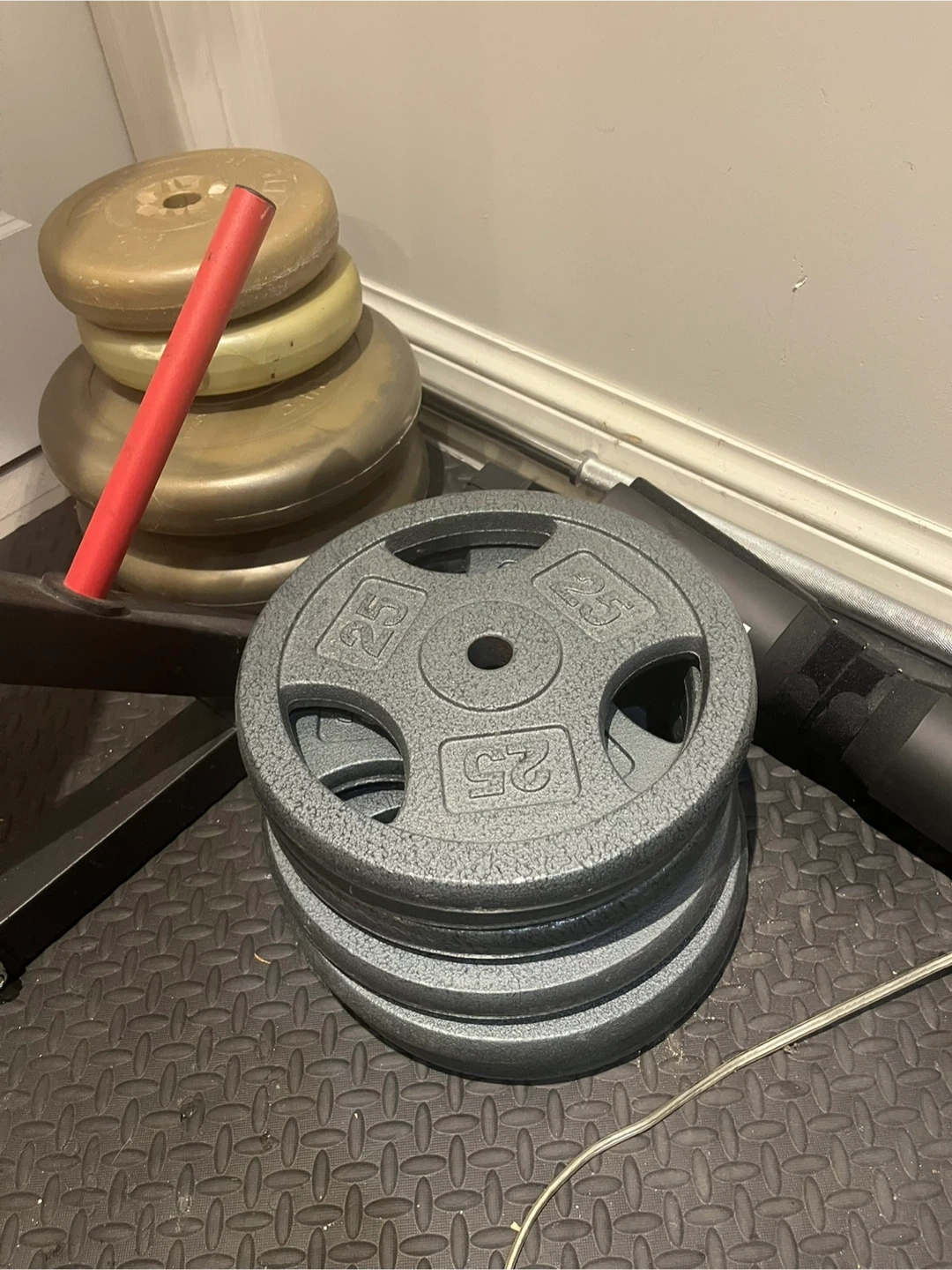 This is the AmStaff TR057D Squat/Press Rack. It's a sturdy rack for your home gym. Includes the 35lb bar, eight 25lb and two 10lb plates, as well as assorted smaller plates seen in last photo. Does not include bench. Sold as a package.
