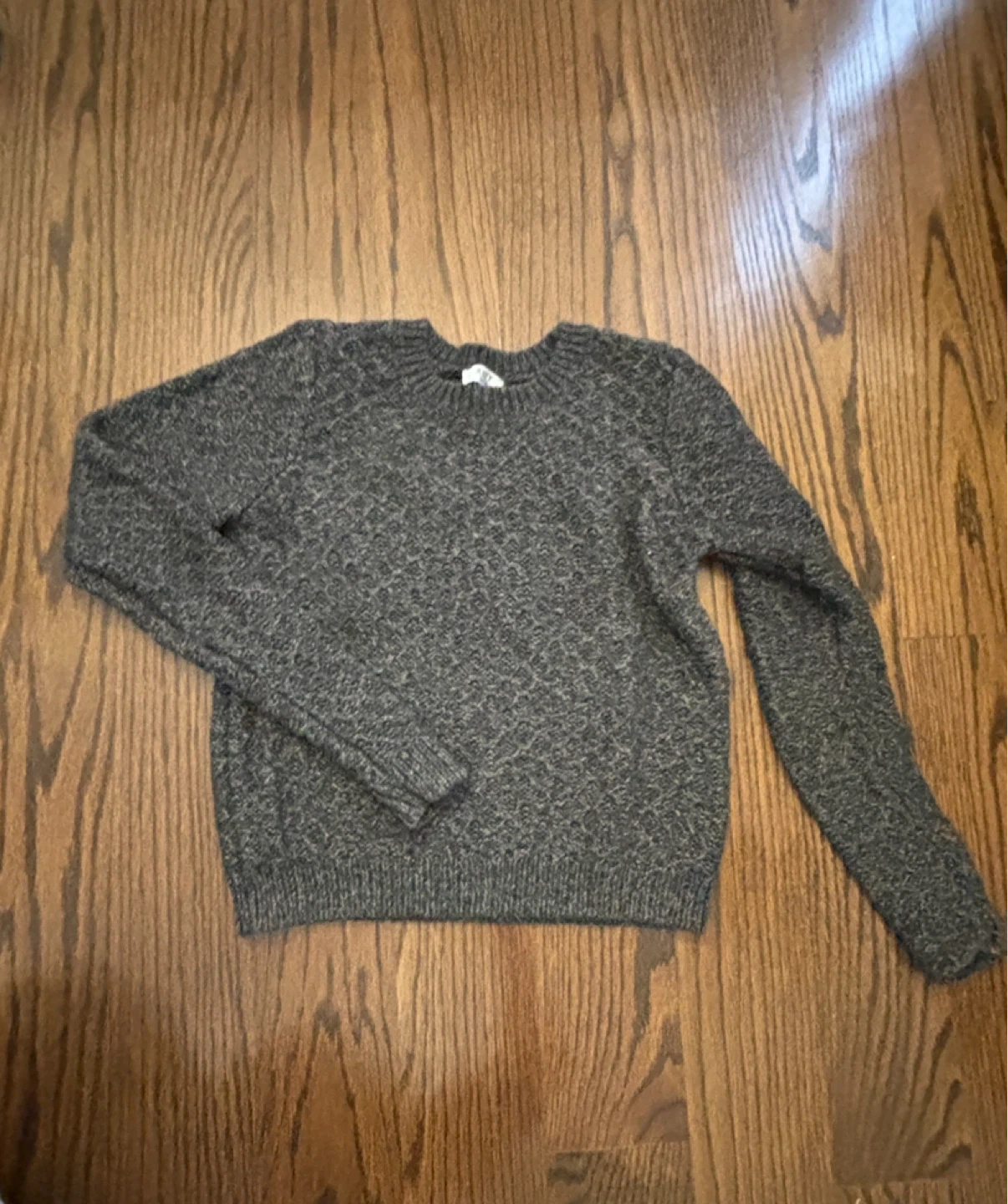 A cozy grey crew neck sweater with a unique textured pattern. It's a versatile piece for layering. Material is soft to the touch.