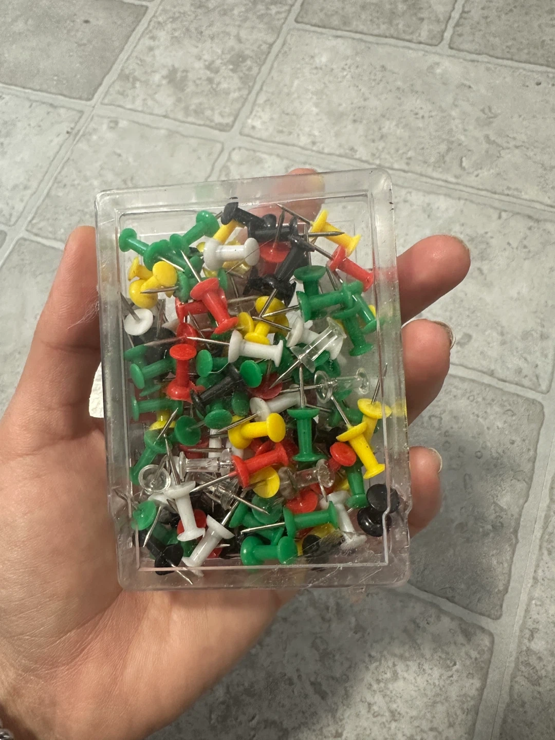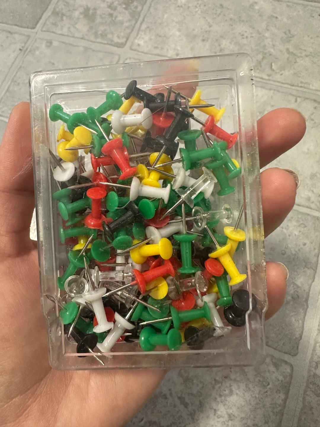 A container of assorted coloured push pins. Includes red, green, yellow, black, and white pins. These are useful for hanging posters or documents on corkboards or walls.