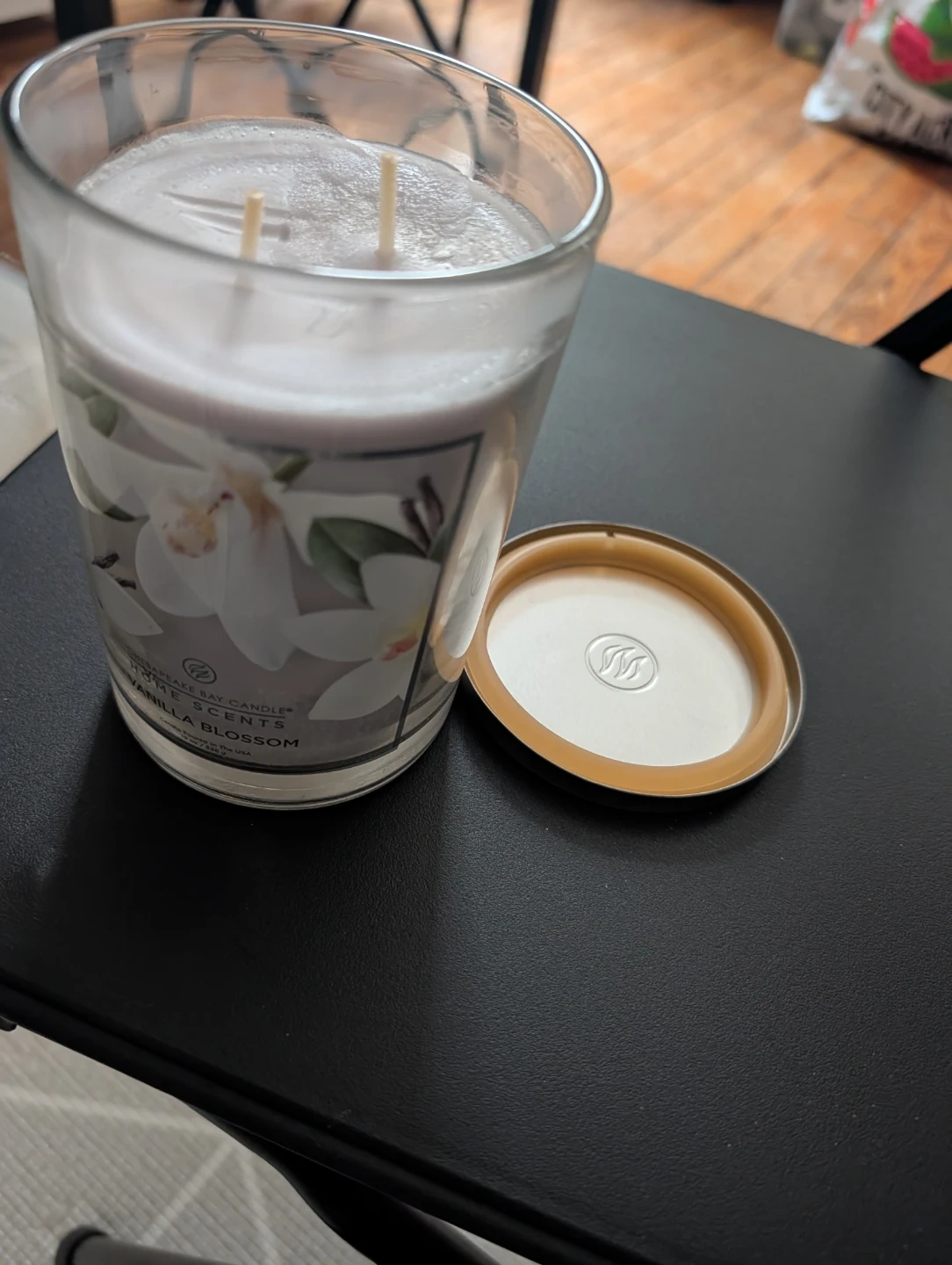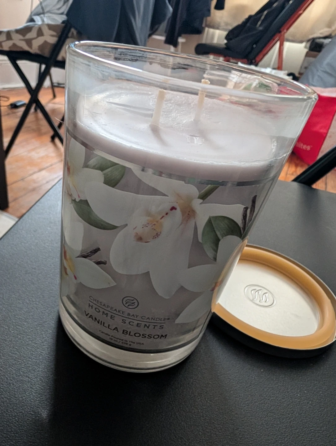 This is a Chesapeake Bay Candle Home Scents Vanilla Blossom candle. It's a 19 oz candle with two wicks. Made with soy wax for a cleaner burn.