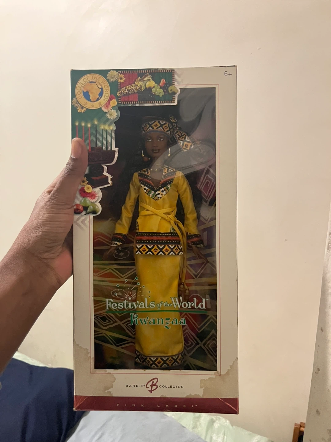 This is a Barbie from the Dolls of the World collection, celebrating Kwanzaa. It's a pink label collector doll. The doll is dressed in traditional Kwanzaa attire.